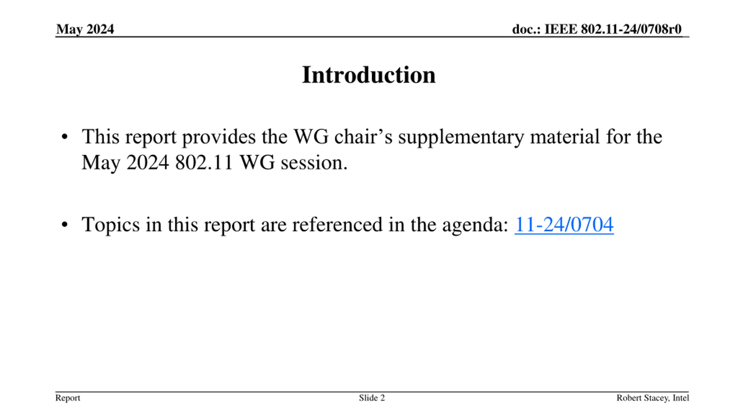 May 2024 doc.: IEEE 802.11-24/0708r0 Introduction This report provides the WG chair s supplementary material for the May 2024 802.11 WG session. Topics in this report are referenced in the agenda: 11-24/0704 Report Slide 2 Robert Stacey, Intel