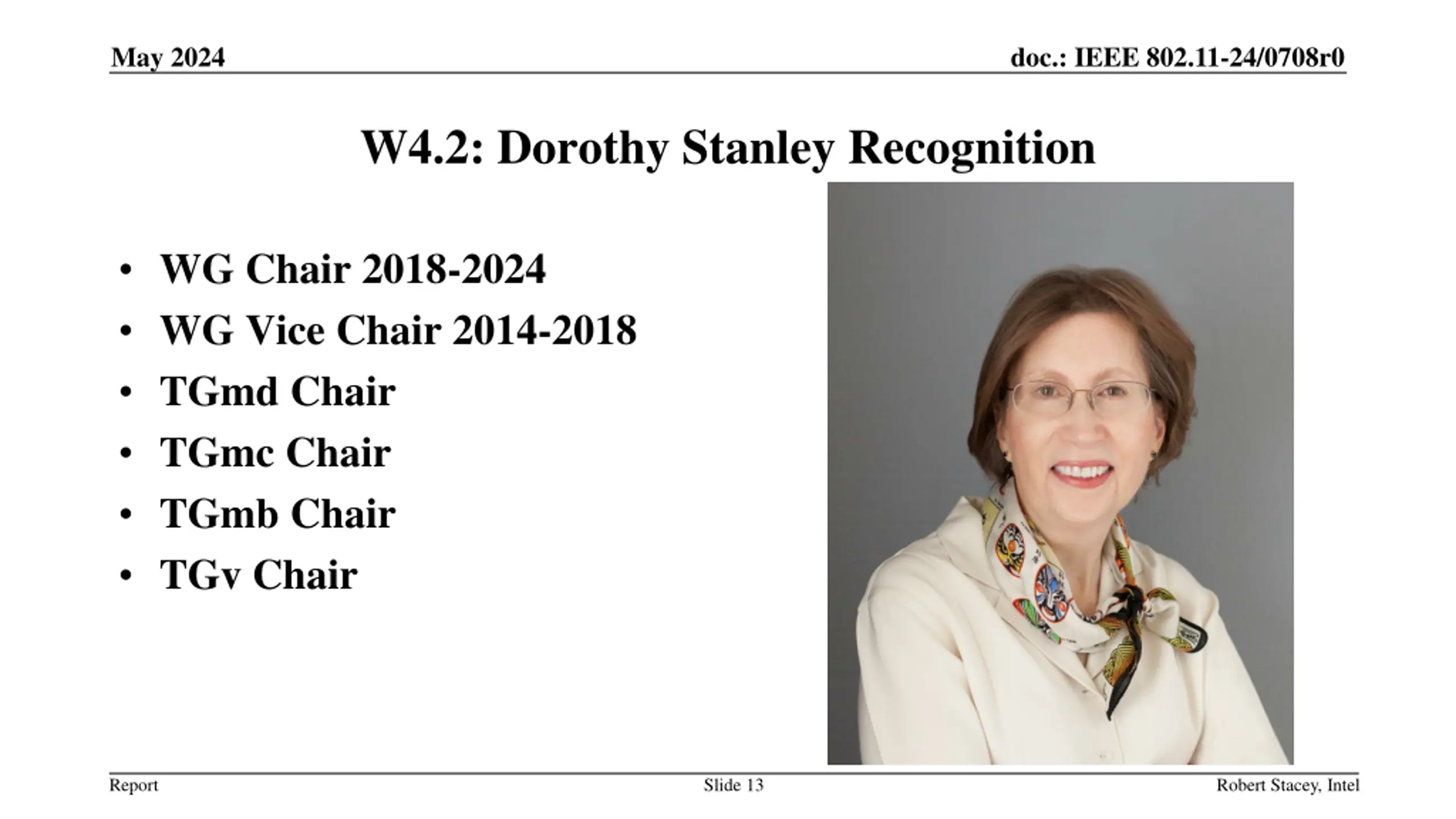 May 2024 doc.: IEEE 802.11-24/0708r0 W4.2: Dorothy Stanley Recognition WG Chair 2018-2024 WG Vice Chair 2014-2018 TGmd Chair TGmc Chair TGmb Chair TGv Chair Report Slide 13 Robert Stacey, Intel