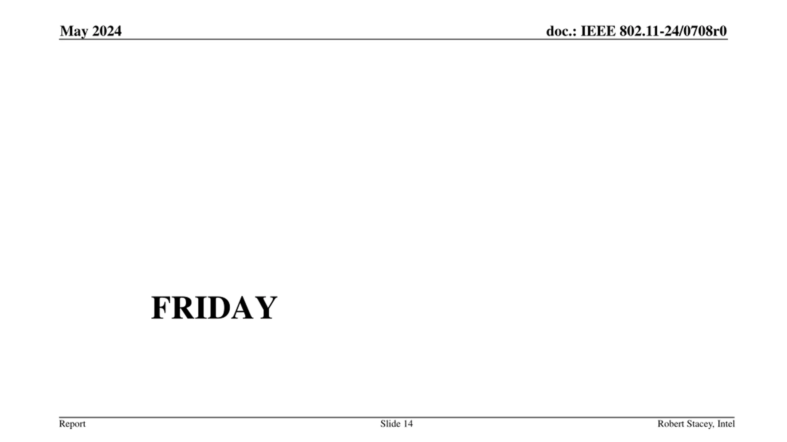 May 2024 doc.: IEEE 802.11-24/0708r0 FRIDAY Report Slide 14 Robert Stacey, Intel