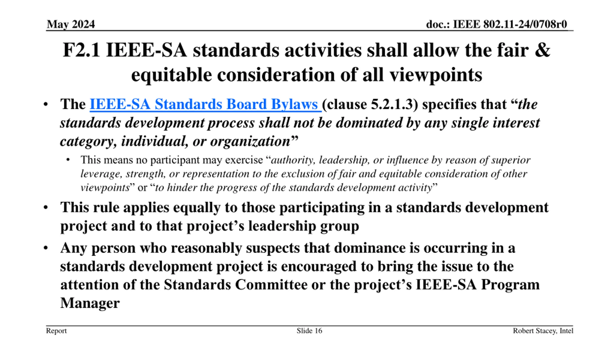 May 2024 doc.: IEEE 802.11-24/0708r0 F2.1 IEEE-SA standards activities shall allow the fair & equitable consideration of all viewpoints The IEEE-SA Standards Board Bylaws (clause 5.2.1.3) specifies that the standards development process shall not be dominated by any single interest category, individual, or organization This means no participant may exercise authority, leadership, or influence by reason of superior leverage, strength, or representation to the exclusion of fair and equitable consideration of other viewpoints or to hinder the progress of the standards development activity This rule applies equally to those participating in a standards development project and to that project s leadership group Any person who reasonably suspects that dominance is occurring in a standards development project is encouraged to bring the issue to the attention of the Standards Committee or the project s IEEE-SA Program Manager Report Slide 16 Robert Stacey, Intel