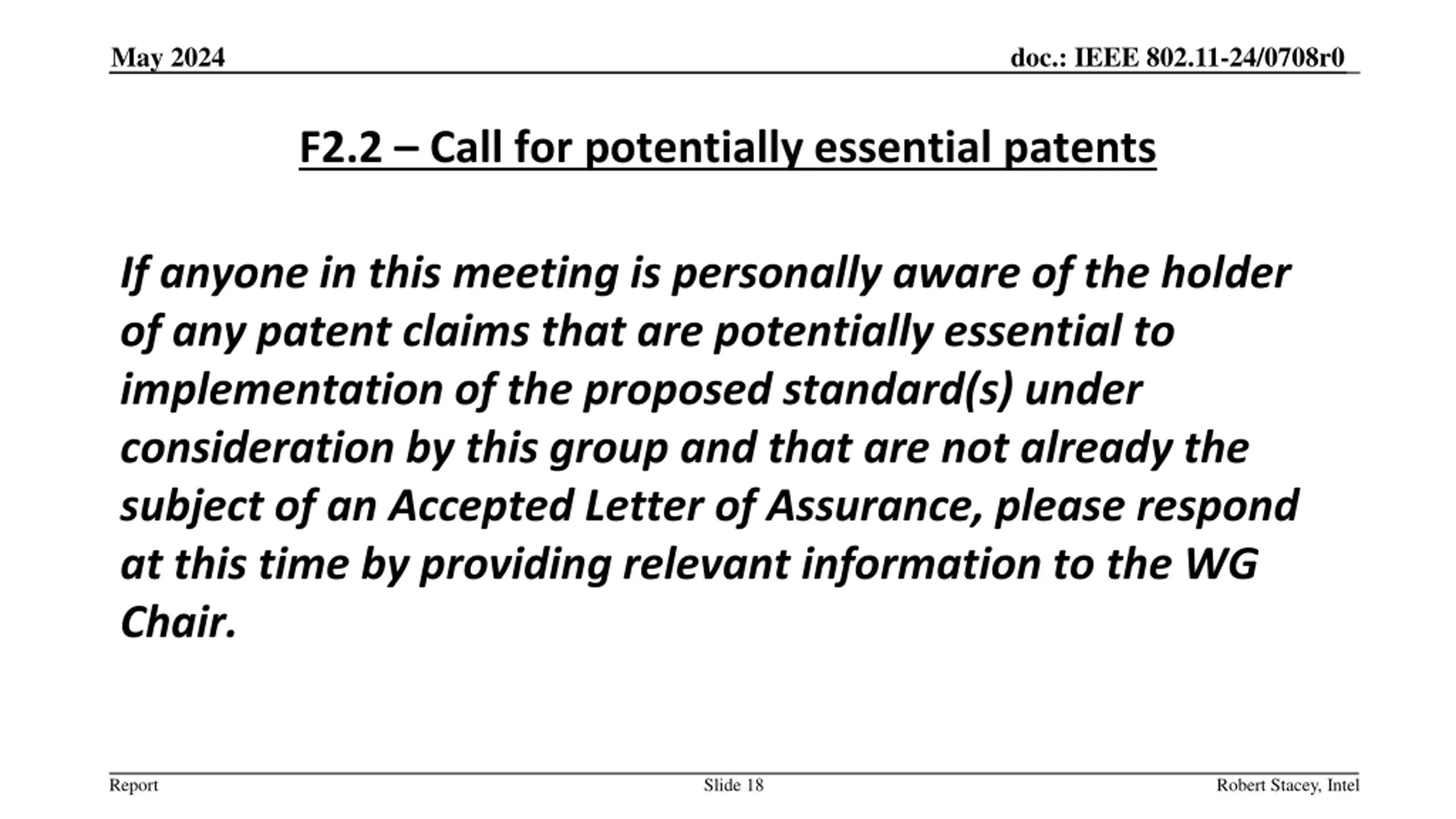 May 2024 doc.: IEEE 802.11-24/0708r0 F2.2 Call for potentially essential patents If anyone in this meeting is personally aware of the holder of any patent claims that are potentially essential to implementation of the proposed standard(s) under consideration by this group and that are not already the subject of an Accepted Letter of Assurance, please respond at this time by providing relevant information to the WG Chair. Report Slide 18 Robert Stacey, Intel