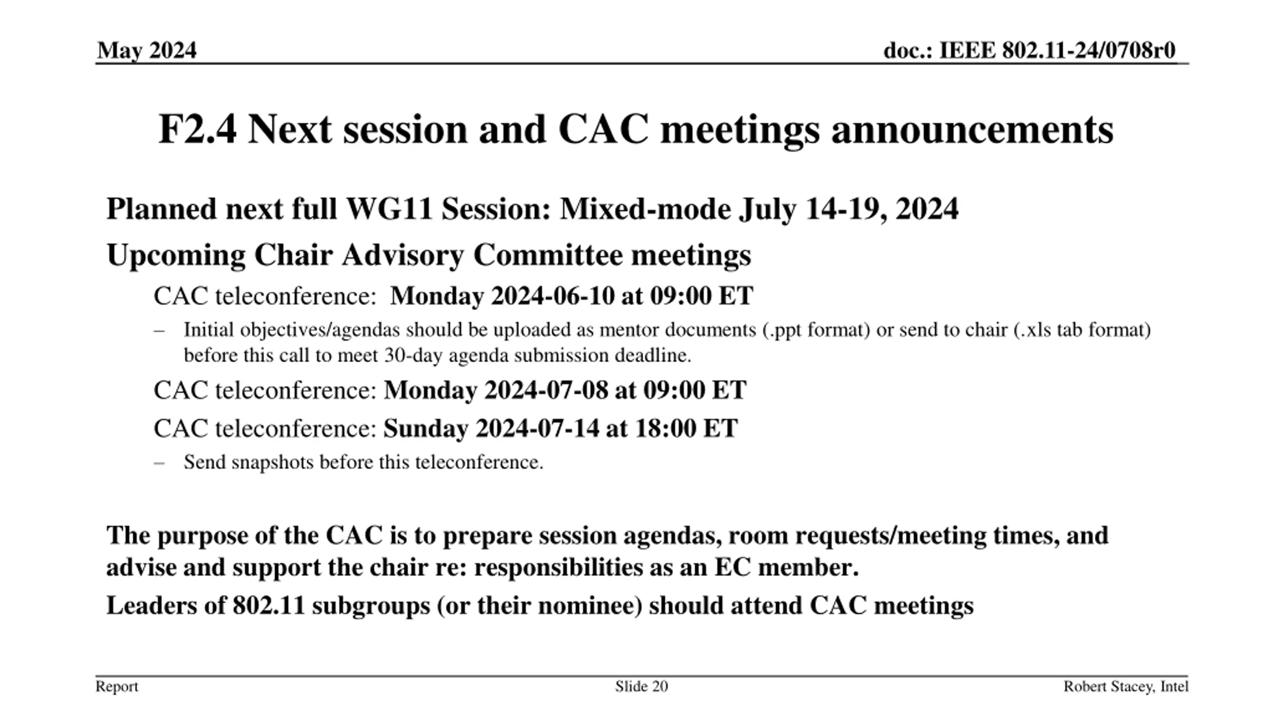 May 2024 doc.: IEEE 802.11-24/0708r0 F2.4 Next session and CAC meetings announcements Planned next full WG11 Session: Mixed-mode July 14-19, 2024 Upcoming Chair Advisory Committee meetings CAC teleconference: Monday 2024-06-10 at 09:00 ET Initial objectives/agendas should be uploaded as mentor documents (.ppt format) or send to chair (.xls tab format) before this call to meet 30-day agenda submission deadline. CAC teleconference: Monday 2024-07-08 at 09:00 ET CAC teleconference: Sunday 2024-07-14 at 18:00 ET Send snapshots before this teleconference. The purpose of the CAC is to prepare session agendas, room requests/meeting times, and advise and support the chair re: responsibilities as an EC member. Leaders of 802.11 subgroups (or their nominee) should attend CAC meetings Report Slide 20 Robert Stacey, Intel