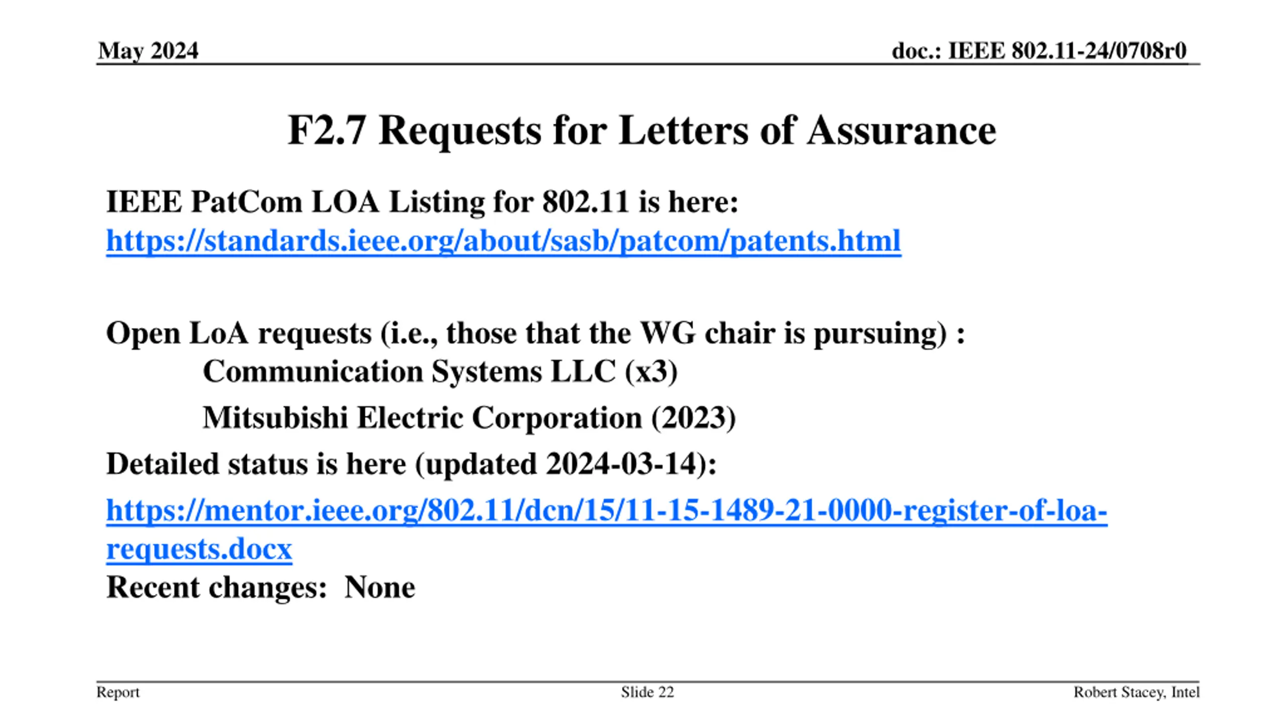 May 2024 doc.: IEEE 802.11-24/0708r0 F2.7 Requests for Letters of Assurance IEEE PatCom LOA Listing for 802.11 is here: https://standards.ieee.org/about/sasb/patcom/patents.html Open LoA requests (i.e., those that the WG chair is pursuing) : Communication Systems LLC (x3) Mitsubishi Electric Corporation (2023) Detailed status is here (updated 2024-03-14): https://mentor.ieee.org/802.11/dcn/15/11-15-1489-21-0000-register-of-loa- requests.docx Recent changes: None Report Slide 22 Robert Stacey, Intel