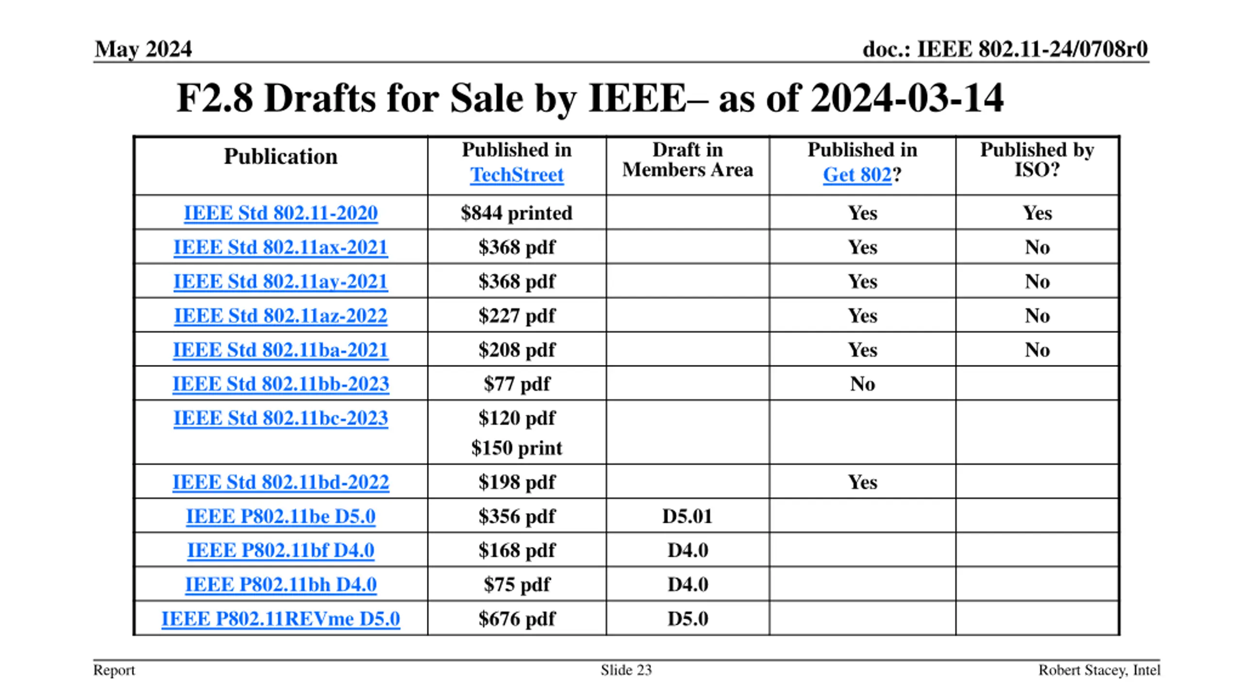 May 2024 doc.: IEEE 802.11-24/0708r0 F2.8 Drafts for Sale by IEEE as of 2024-03-14 Published in TechStreet Draft in Members Area Published in Get 802? Published by ISO? Publication IEEE Std 802.11-2020 IEEE Std 802.11ax-2021 IEEE Std 802.11ay-2021 IEEE Std 802.11az-2022 IEEE Std 802.11ba-2021 IEEE Std 802.11bb-2023 IEEE Std 802.11bc-2023 $844 printed $368 pdf $368 pdf $227 pdf $208 pdf $77 pdf $120 pdf $150 print $198 pdf $356 pdf $168 pdf $75 pdf $676 pdf Yes Yes Yes Yes Yes No Yes No No No No IEEE Std 802.11bd-2022 IEEE P802.11be D5.0 IEEE P802.11bf D4.0 IEEE P802.11bh D4.0 IEEE P802.11REVme D5.0 Yes D5.01 D4.0 D4.0 D5.0 Report Slide 23 Robert Stacey, Intel