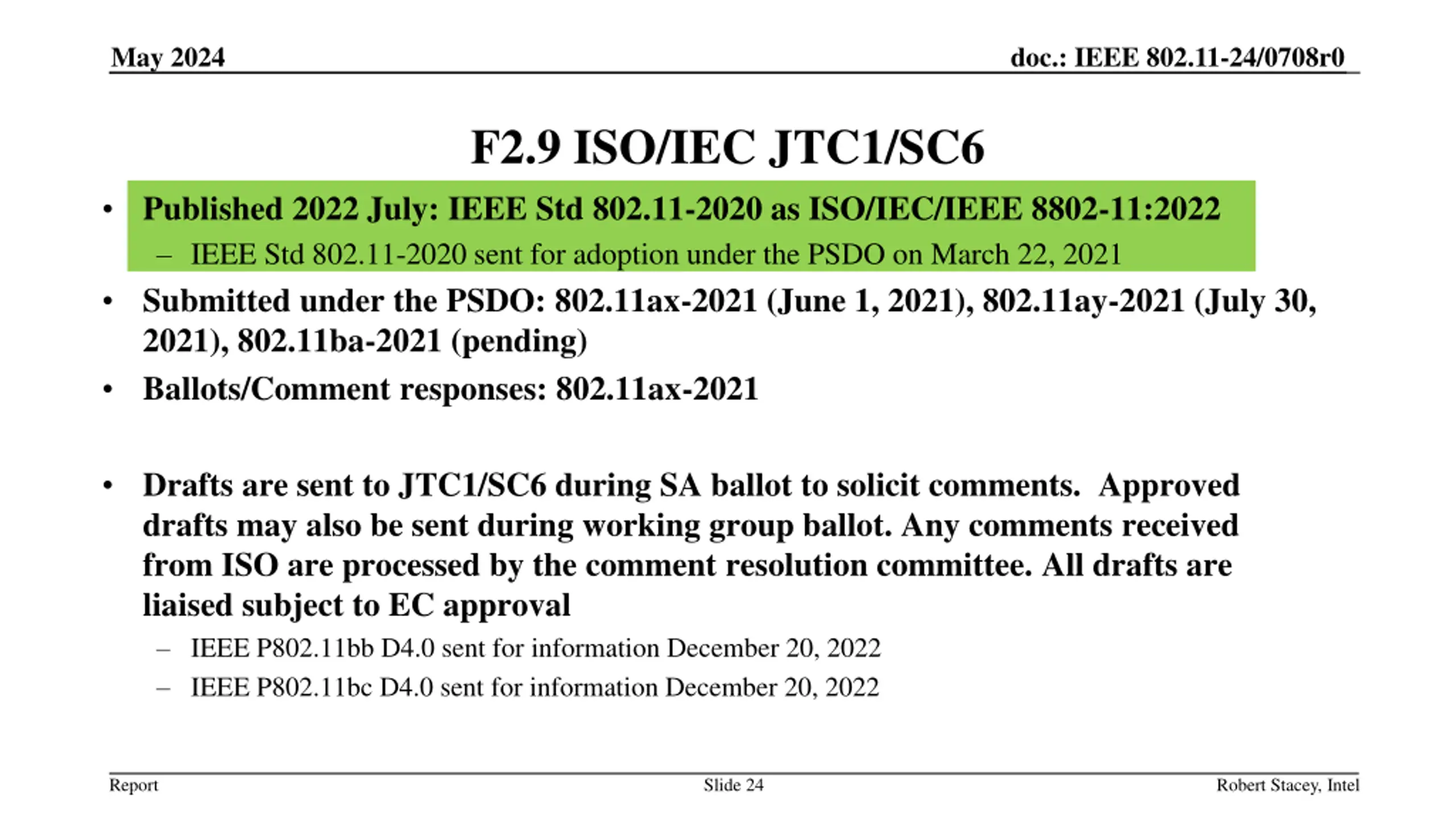 May 2024 doc.: IEEE 802.11-24/0708r0 F2.9 ISO/IEC JTC1/SC6 Published 2022 July: IEEE Std 802.11-2020 as ISO/IEC/IEEE 8802-11:2022 IEEE Std 802.11-2020 sent for adoption under the PSDO on March 22, 2021 Submitted under the PSDO: 802.11ax-2021 (June 1, 2021), 802.11ay-2021 (July 30, 2021), 802.11ba-2021 (pending) Ballots/Comment responses: 802.11ax-2021 Drafts are sent to JTC1/SC6 during SA ballot to solicit comments. Approved drafts may also be sent during working group ballot. Any comments received from ISO are processed by the comment resolution committee. All drafts are liaised subject to EC approval IEEE P802.11bb D4.0 sent for information December 20, 2022 IEEE P802.11bc D4.0 sent for information December 20, 2022 Report Slide 24 Robert Stacey, Intel