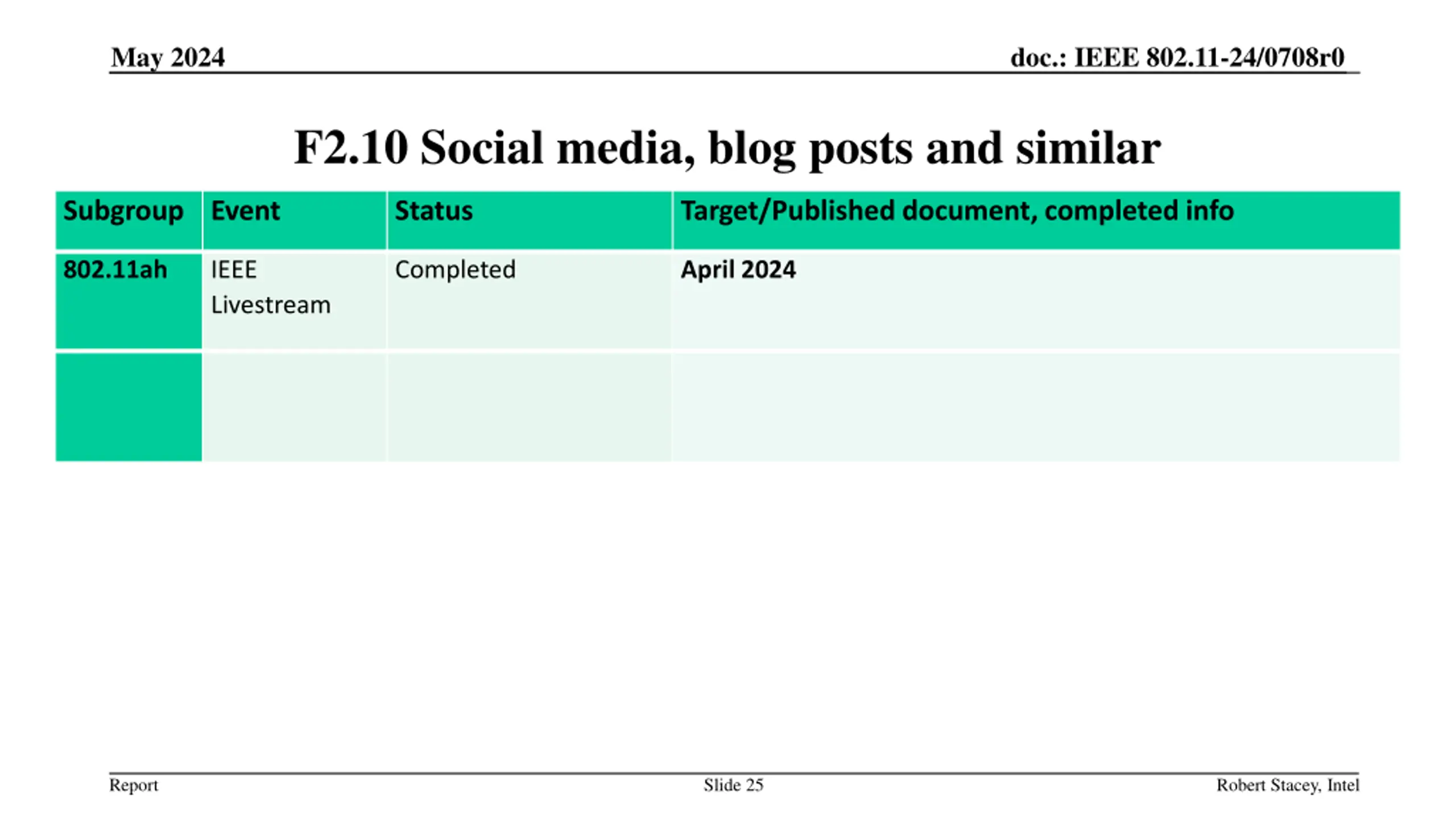 May 2024 doc.: IEEE 802.11-24/0708r0 F2.10 Social media, blog posts and similar Subgroup Event Status Target/Published document, completed info 802.11ah IEEE Livestream Completed April 2024 Report Slide 25 Robert Stacey, Intel