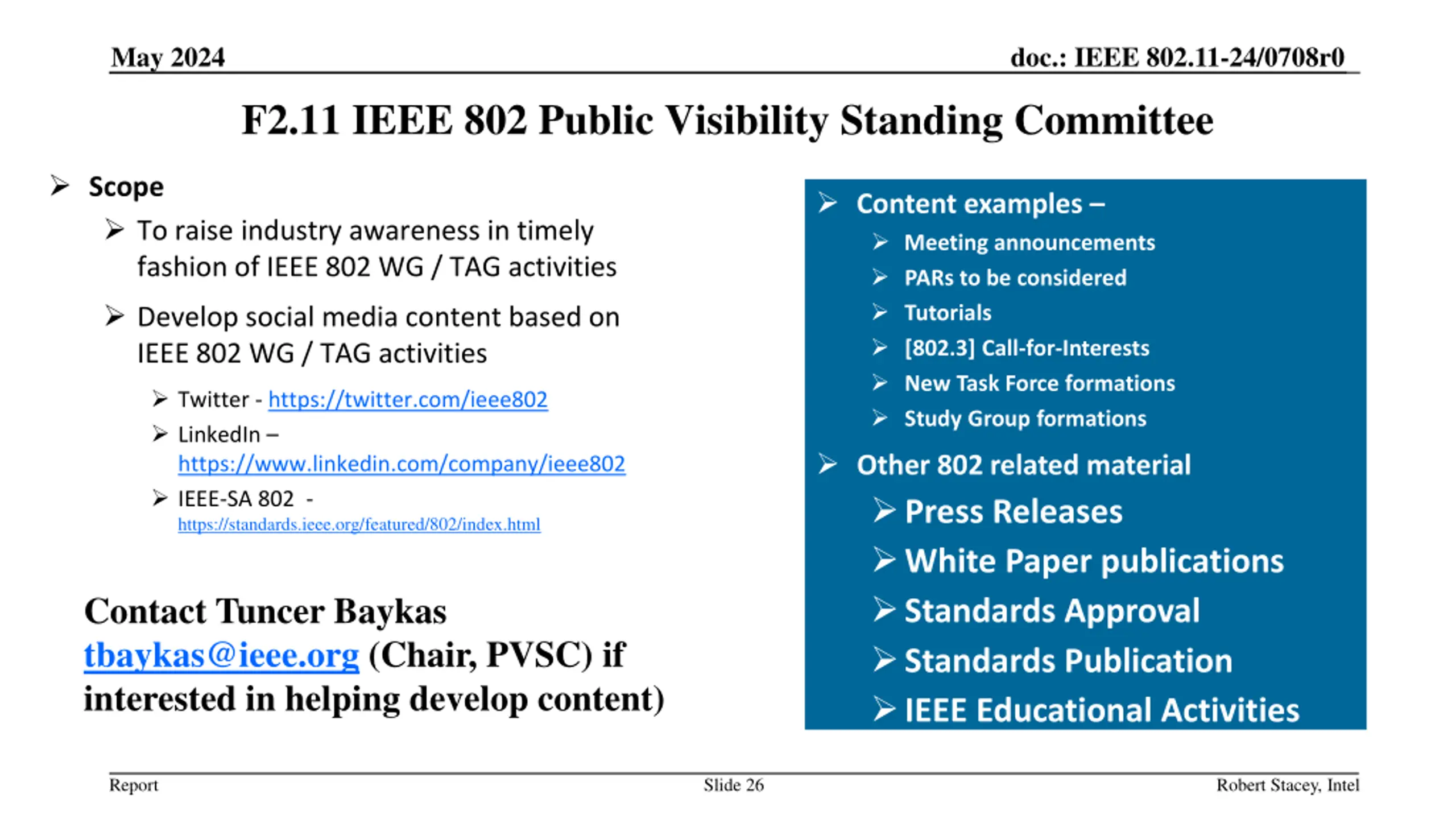 May 2024 doc.: IEEE 802.11-24/0708r0 F2.11 IEEE 802 Public Visibility Standing Committee Scope To raise industry awareness in timely fashion of IEEE 802 WG / TAG activities Develop social media content based on IEEE 802 WG / TAG activities Content examples Meeting announcements PARs to be considered Tutorials [802.3] Call-for-Interests New Task Force formations Study Group formations Other 802 related material Press Releases White Paper publications Standards Approval Standards Publication IEEE Educational Activities Tech Talks Other 802 approved news Twitter - https://twitter.com/ieee802 LinkedIn https://www.linkedin.com/company/ieee802 IEEE-SA 802 - https://standards.ieee.org/featured/802/index.html Contact Tuncer Baykas tbaykas@ieee.org (Chair, PVSC) if interested in helping develop content) Report Slide 26 Robert Stacey, Intel