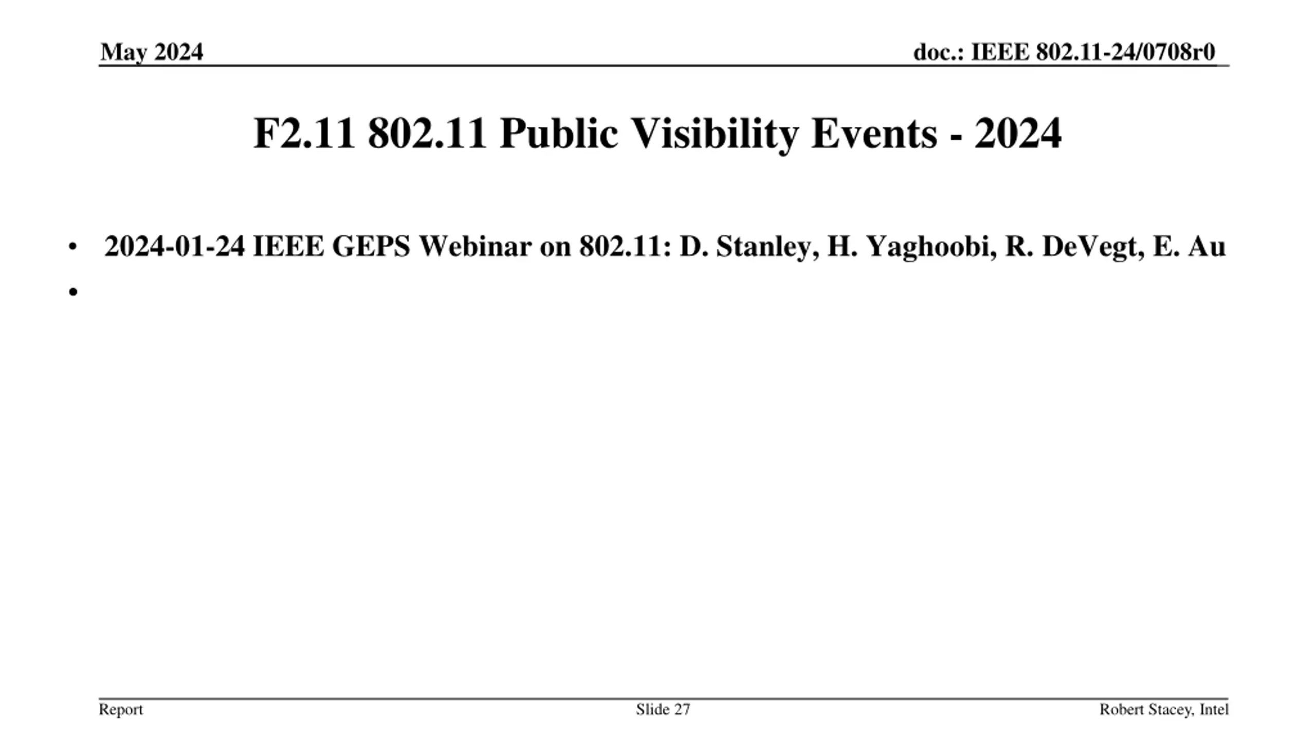 May 2024 doc.: IEEE 802.11-24/0708r0 F2.11 802.11 Public Visibility Events - 2024 2024-01-24 IEEE GEPS Webinar on 802.11: D. Stanley, H. Yaghoobi, R. DeVegt, E. Au Report Slide 27 Robert Stacey, Intel
