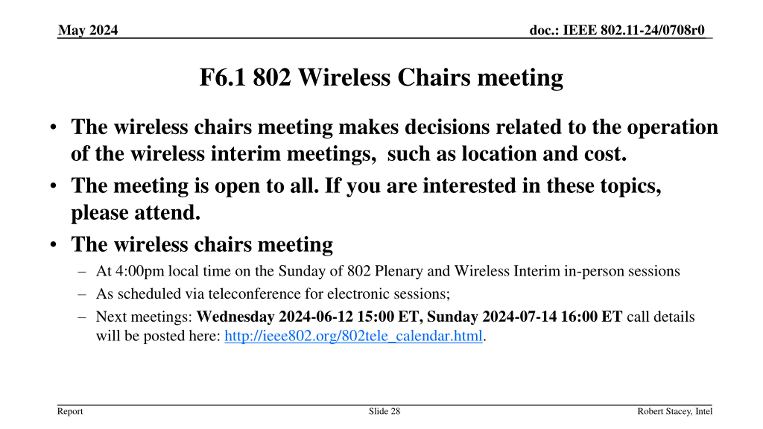 May 2024 doc.: IEEE 802.11-24/0708r0 F6.1 802 Wireless Chairs meeting The wireless chairs meeting makes decisions related to the operation of the wireless interim meetings, such as location and cost. The meeting is open to all. If you are interested in these topics, please attend. The wireless chairs meeting At 4:00pm local time on the Sunday of 802 Plenary and Wireless Interim in-person sessions As scheduled via teleconference for electronic sessions; Next meetings: Wednesday 2024-06-12 15:00 ET, Sunday 2024-07-14 16:00 ET call details will be posted here: http://ieee802.org/802tele_calendar.html. Report Slide 28 Robert Stacey, Intel