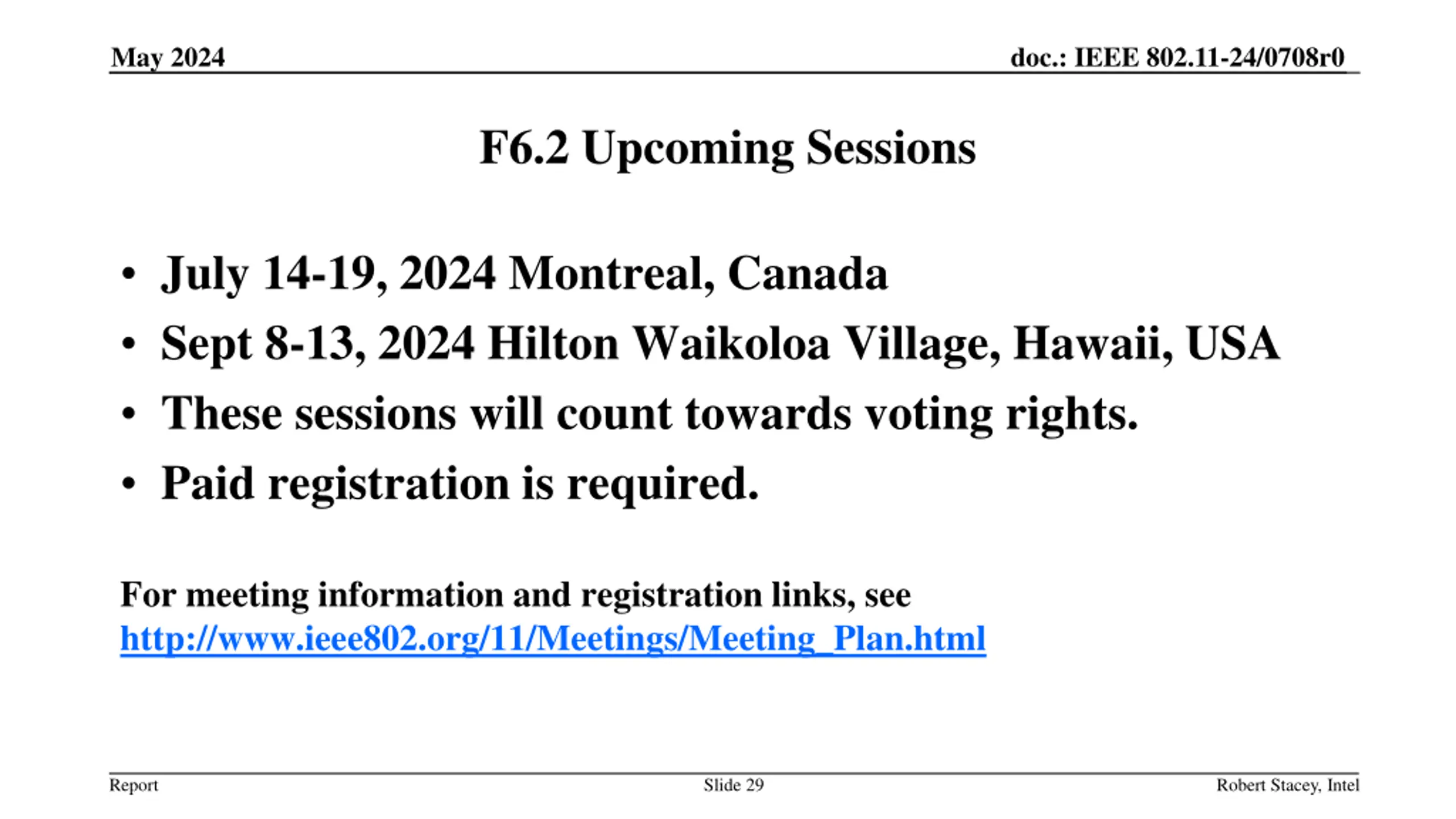 May 2024 doc.: IEEE 802.11-24/0708r0 F6.2 Upcoming Sessions July 14-19, 2024 Montreal, Canada Sept 8-13, 2024 Hilton Waikoloa Village, Hawaii, USA These sessions will count towards voting rights. Paid registration is required. For meeting information and registration links, see http://www.ieee802.org/11/Meetings/Meeting_Plan.html Report Slide 29 Robert Stacey, Intel