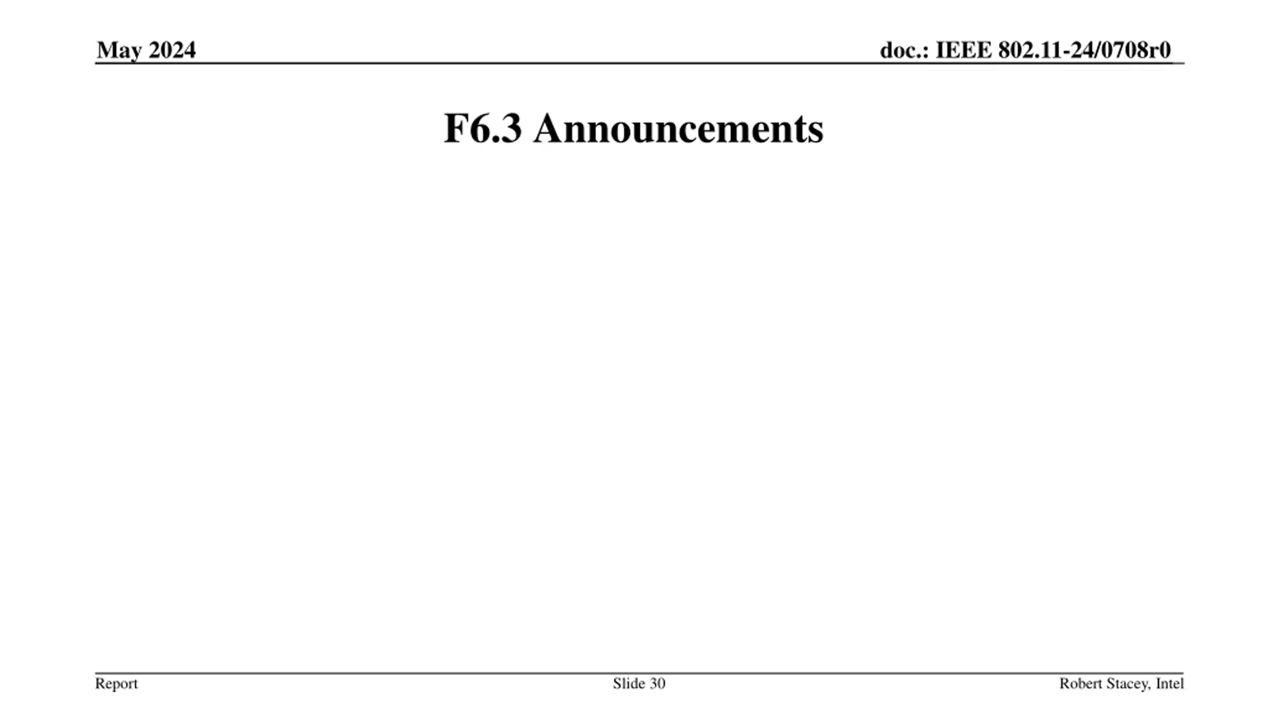 May 2024 doc.: IEEE 802.11-24/0708r0 F6.3 Announcements Report Slide 30 Robert Stacey, Intel