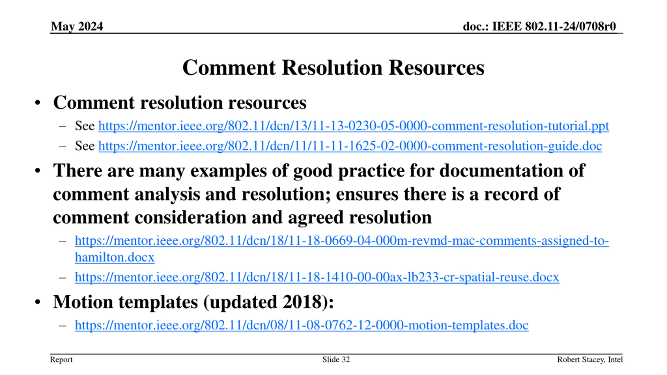 May 2024 doc.: IEEE 802.11-24/0708r0 Comment Resolution Resources Comment resolution resources See https://mentor.ieee.org/802.11/dcn/13/11-13-0230-05-0000-comment-resolution-tutorial.ppt See https://mentor.ieee.org/802.11/dcn/11/11-11-1625-02-0000-comment-resolution-guide.doc There are many examples of good practice for documentation of comment analysis and resolution; ensures there is a record of comment consideration and agreed resolution https://mentor.ieee.org/802.11/dcn/18/11-18-0669-04-000m-revmd-mac-comments-assigned-to- hamilton.docx https://mentor.ieee.org/802.11/dcn/18/11-18-1410-00-00ax-lb233-cr-spatial-reuse.docx Motion templates (updated 2018): https://mentor.ieee.org/802.11/dcn/08/11-08-0762-12-0000-motion-templates.doc Report Slide 32 Robert Stacey, Intel