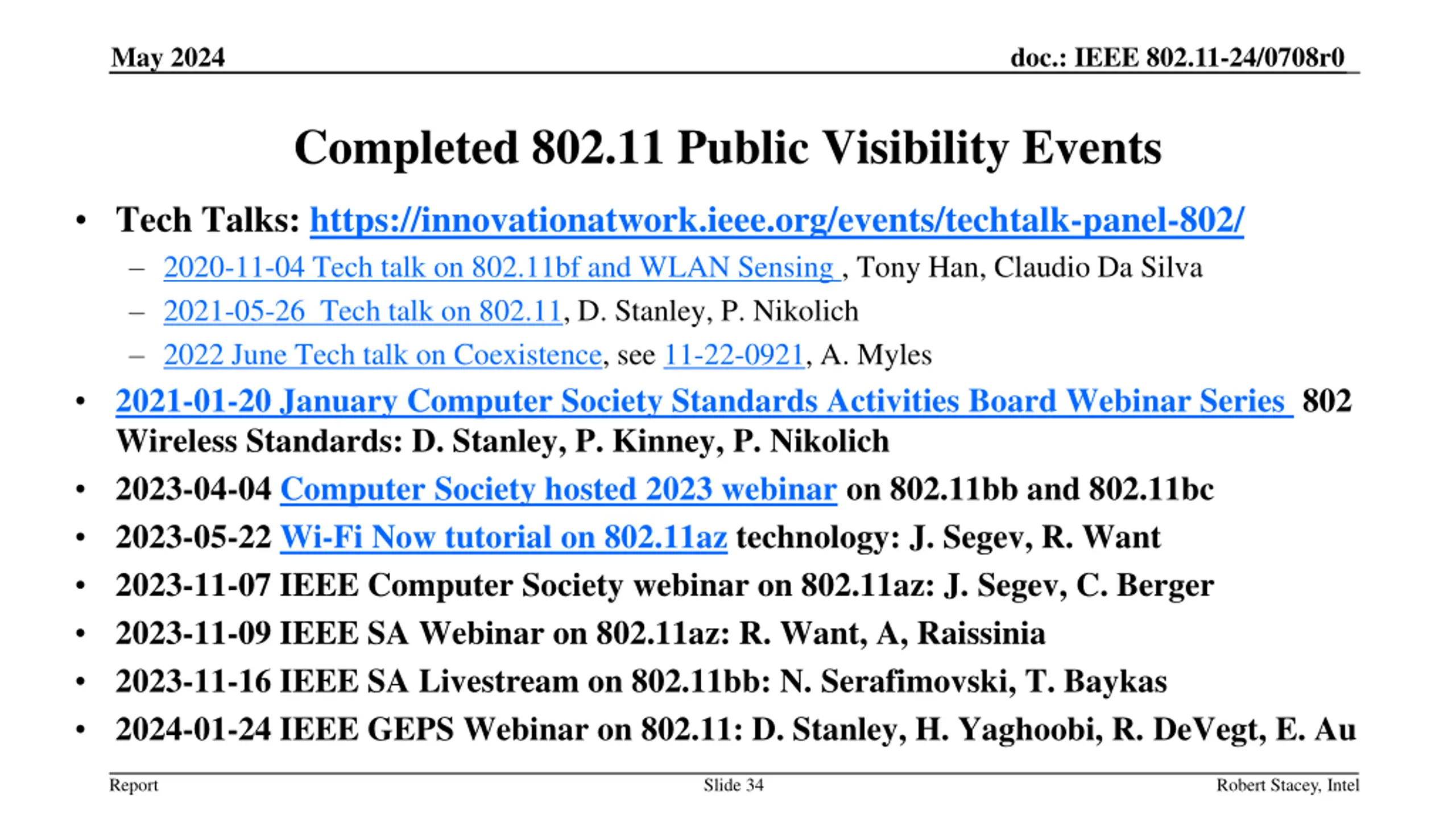 May 2024 doc.: IEEE 802.11-24/0708r0 Completed 802.11 Public Visibility Events Tech Talks: https://innovationatwork.ieee.org/events/techtalk-panel-802/ 2020-11-04 Tech talk on 802.11bf and WLAN Sensing , Tony Han, Claudio Da Silva 2021-05-26 Tech talk on 802.11, D. Stanley, P. Nikolich 2022 June Tech talk on Coexistence, see 11-22-0921, A. Myles 2021-01-20 January Computer Society Standards Activities Board Webinar Series 802 Wireless Standards: D. Stanley, P. Kinney, P. Nikolich 2023-04-04 Computer Society hosted 2023 webinar on 802.11bb and 802.11bc 2023-05-22 Wi-Fi Now tutorial on 802.11az technology: J. Segev, R. Want 2023-11-07 IEEE Computer Society webinar on 802.11az: J. Segev, C. Berger 2023-11-09 IEEE SA Webinar on 802.11az: R. Want, A, Raissinia 2023-11-16 IEEE SA Livestream on 802.11bb: N. Serafimovski, T. Baykas 2024-01-24 IEEE GEPS Webinar on 802.11: D. Stanley, H. Yaghoobi, R. DeVegt, E. Au Report Slide 34 Robert Stacey, Intel
