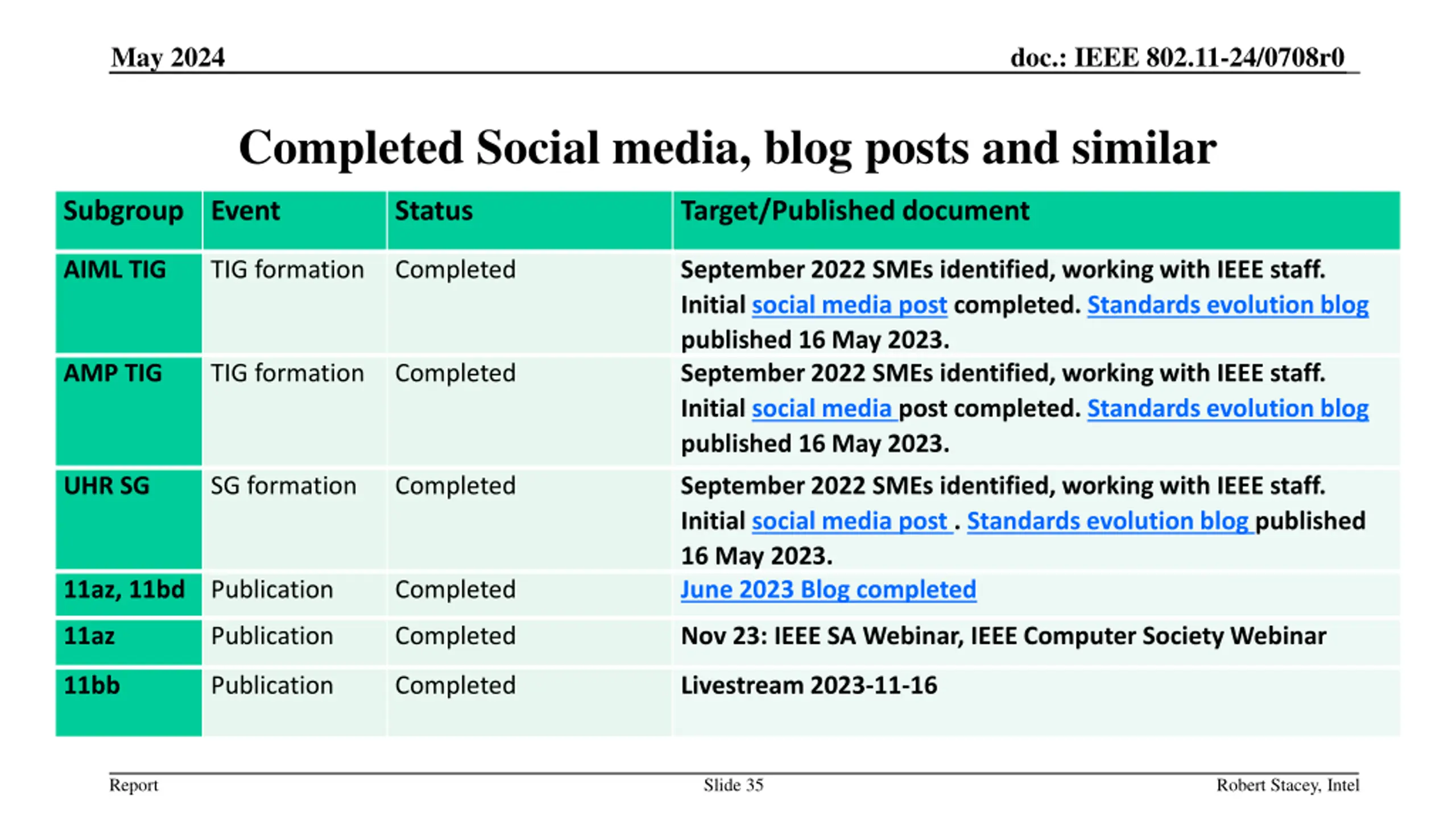 May 2024 doc.: IEEE 802.11-24/0708r0 Completed Social media, blog posts and similar Subgroup Event Status Target/Published document AIML TIG TIG formation Completed September 2022 SMEs identified, working with IEEE staff. Initial social media post completed. Standards evolution blog published 16 May 2023. September 2022 SMEs identified, working with IEEE staff. Initial social media post completed. Standards evolution blog published 16 May 2023. AMP TIG TIG formation Completed UHR SG SG formation Completed September 2022 SMEs identified, working with IEEE staff. Initial social media post . Standards evolution blog published 16 May 2023. June 2023 Blog completed 11az, 11bd Publication Completed 11az Publication Completed Nov 23: IEEE SA Webinar, IEEE Computer Society Webinar 11bb Publication Completed Livestream 2023-11-16 Report Slide 35 Robert Stacey, Intel
