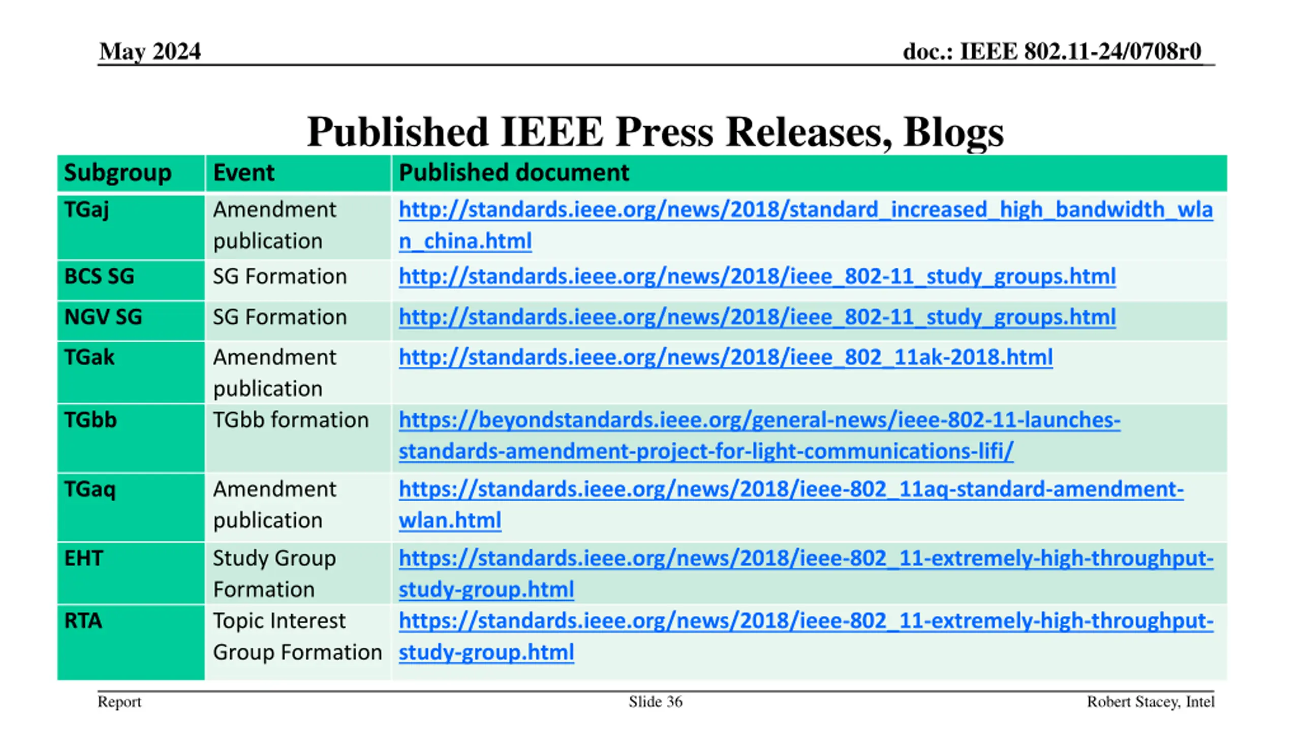 May 2024 doc.: IEEE 802.11-24/0708r0 Published IEEE Press Releases, Blogs Published document Amendment publication n_china.html SG Formation http://standards.ieee.org/news/2018/ieee_802-11_study_groups.html Subgroup TGaj Event http://standards.ieee.org/news/2018/standard_increased_high_bandwidth_wla BCS SG NGV SG SG Formation http://standards.ieee.org/news/2018/ieee_802-11_study_groups.html TGak Amendment publication TGbb formation http://standards.ieee.org/news/2018/ieee_802_11ak-2018.html TGbb https://beyondstandards.ieee.org/general-news/ieee-802-11-launches- standards-amendment-project-for-light-communications-lifi/ TGaq Amendment publication https://standards.ieee.org/news/2018/ieee-802_11aq-standard-amendment- wlan.html EHT Study Group Formation Topic Interest Group Formation https://standards.ieee.org/news/2018/ieee-802_11-extremely-high-throughput- study-group.html https://standards.ieee.org/news/2018/ieee-802_11-extremely-high-throughput- study-group.html RTA Report Slide 36 Robert Stacey, Intel