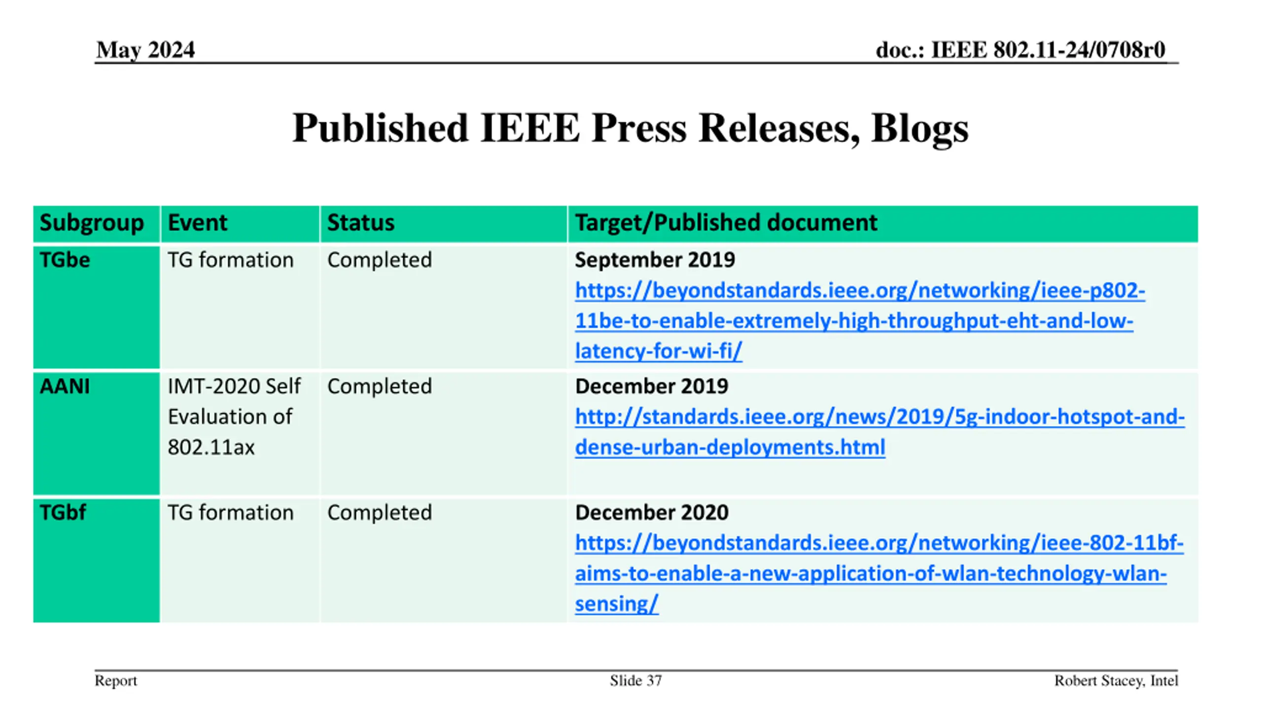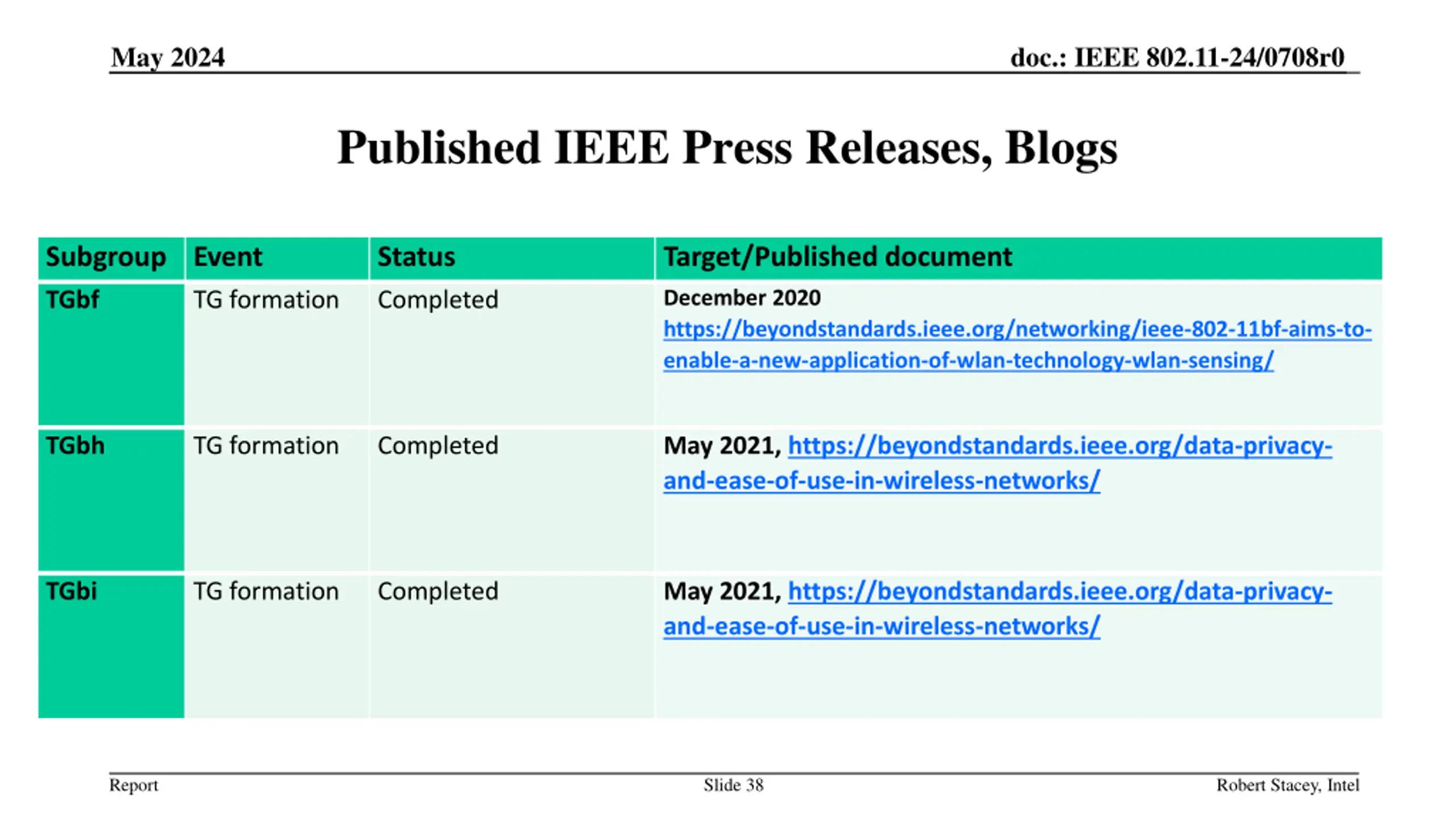 May 2024 doc.: IEEE 802.11-24/0708r0 Published IEEE Press Releases, Blogs Subgroup Event Status Target/Published document TGbe TG formation Completed September 2019 https://beyondstandards.ieee.org/networking/ieee-p802- 11be-to-enable-extremely-high-throughput-eht-and-low- latency-for-wi-fi/ December 2019 http://standards.ieee.org/news/2019/5g-indoor-hotspot-and- dense-urban-deployments.html AANI IMT-2020 Self Evaluation of 802.11ax Completed TGbf TG formation Completed December 2020 https://beyondstandards.ieee.org/networking/ieee-802-11bf- aims-to-enable-a-new-application-of-wlan-technology-wlan- sensing/ Report Slide 37 Robert Stacey, Intel