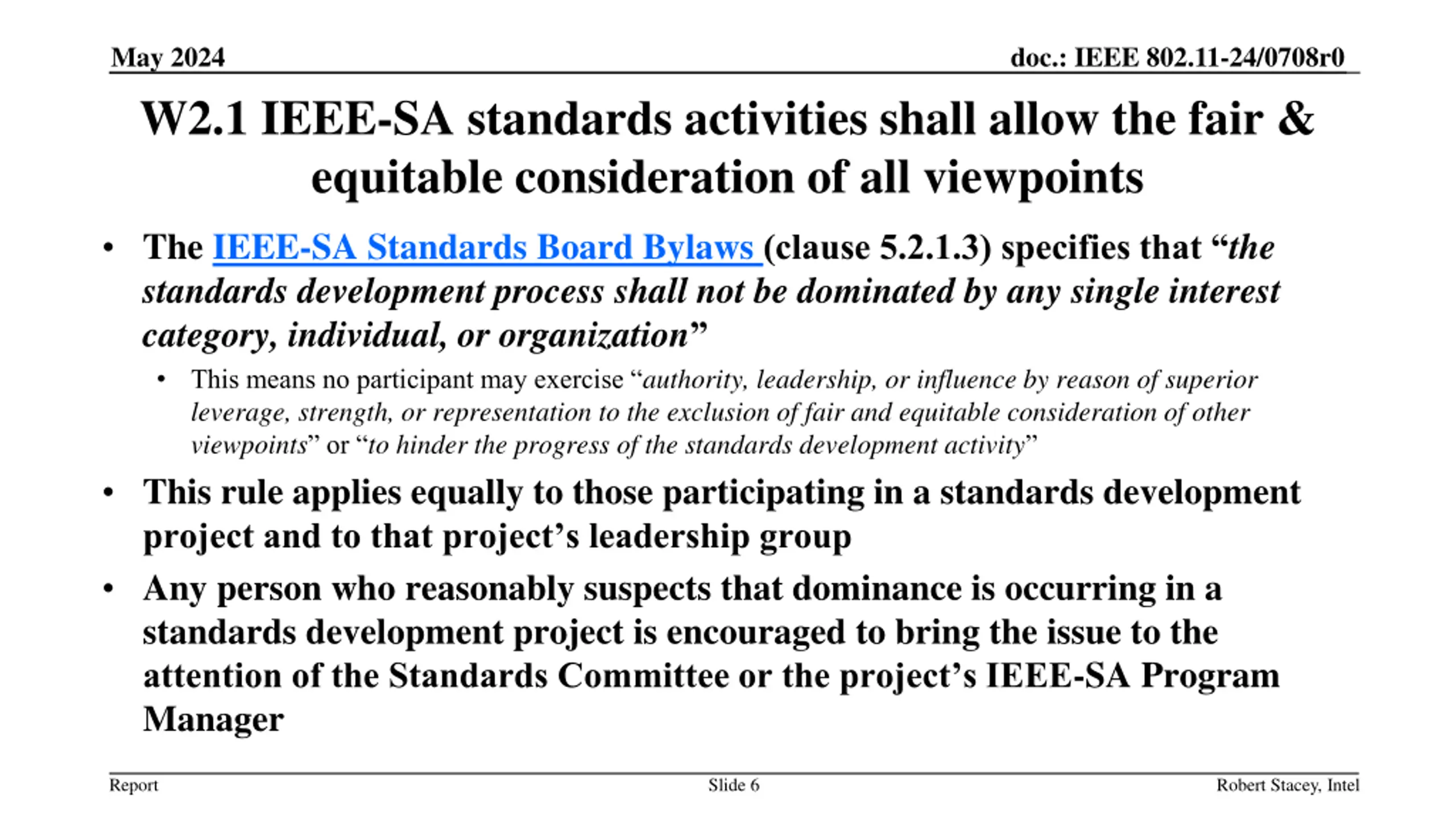 May 2024 doc.: IEEE 802.11-24/0708r0 W2.1 IEEE-SA standards activities shall allow the fair & equitable consideration of all viewpoints The IEEE-SA Standards Board Bylaws (clause 5.2.1.3) specifies that the standards development process shall not be dominated by any single interest category, individual, or organization This means no participant may exercise authority, leadership, or influence by reason of superior leverage, strength, or representation to the exclusion of fair and equitable consideration of other viewpoints or to hinder the progress of the standards development activity This rule applies equally to those participating in a standards development project and to that project s leadership group Any person who reasonably suspects that dominance is occurring in a standards development project is encouraged to bring the issue to the attention of the Standards Committee or the project s IEEE-SA Program Manager Report Slide 6 Robert Stacey, Intel