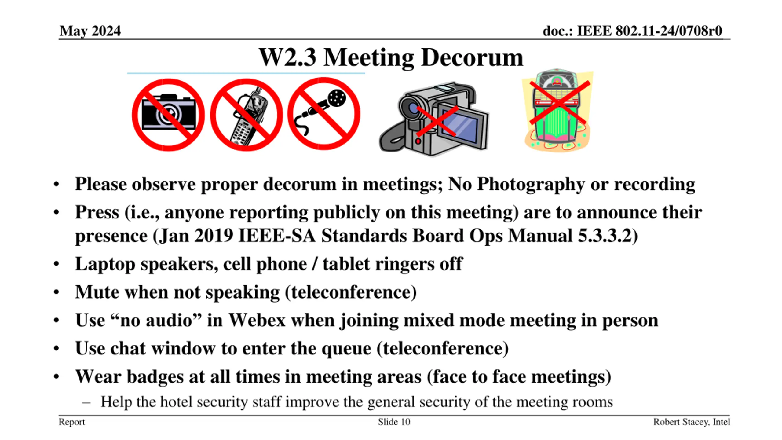 May 2024 doc.: IEEE 802.11-24/0708r0 W2.3 Meeting Decorum Please observe proper decorum in meetings; No Photography or recording Press (i.e., anyone reporting publicly on this meeting) are to announce their presence (Jan 2019 IEEE-SA Standards Board Ops Manual 5.3.3.2) Laptop speakers, cell phone / tablet ringers off Mute when not speaking (teleconference) Use no audio in Webex when joining mixed mode meeting in person Use chat window to enter the queue (teleconference) Wear badges at all times in meeting areas (face to face meetings) Help the hotel security staff improve the general security of the meeting rooms Report Slide 10 Robert Stacey, Intel