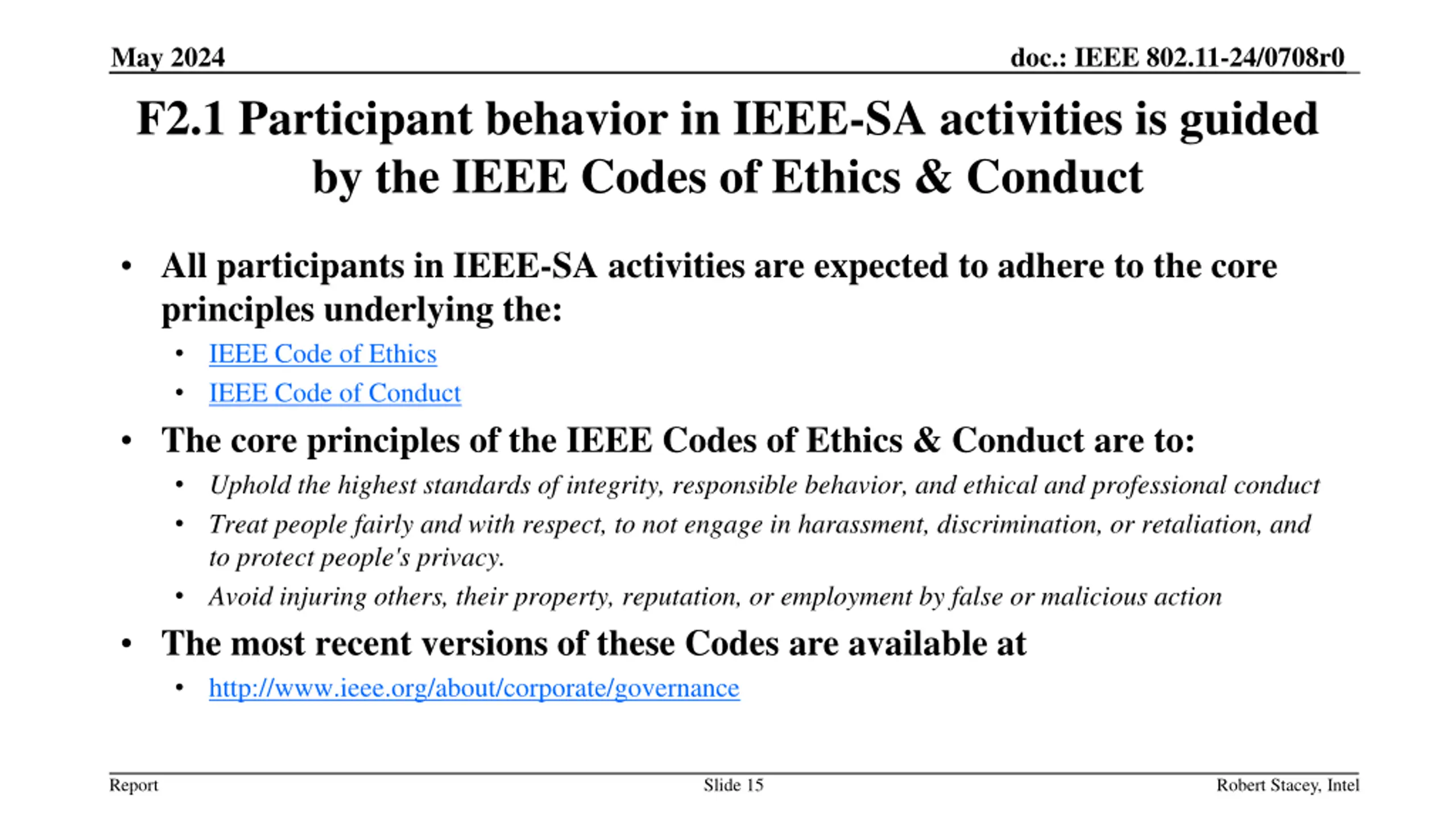 May 2024 F2.1 Participant behavior in IEEE-SA activities is guided by the IEEE Codes of Ethics & Conduct doc.: IEEE 802.11-24/0708r0 All participants in IEEE-SA activities are expected to adhere to the core principles underlying the: IEEE Code of Ethics IEEE Code of Conduct The core principles of the IEEE Codes of Ethics & Conduct are to: Uphold the highest standards of integrity, responsible behavior, and ethical and professional conduct Treat people fairly and with respect, to not engage in harassment, discrimination, or retaliation, and to protect people's privacy. Avoid injuring others, their property, reputation, or employment by false or malicious action The most recent versions of these Codes are available at http://www.ieee.org/about/corporate/governance Report Slide 15 Robert Stacey, Intel