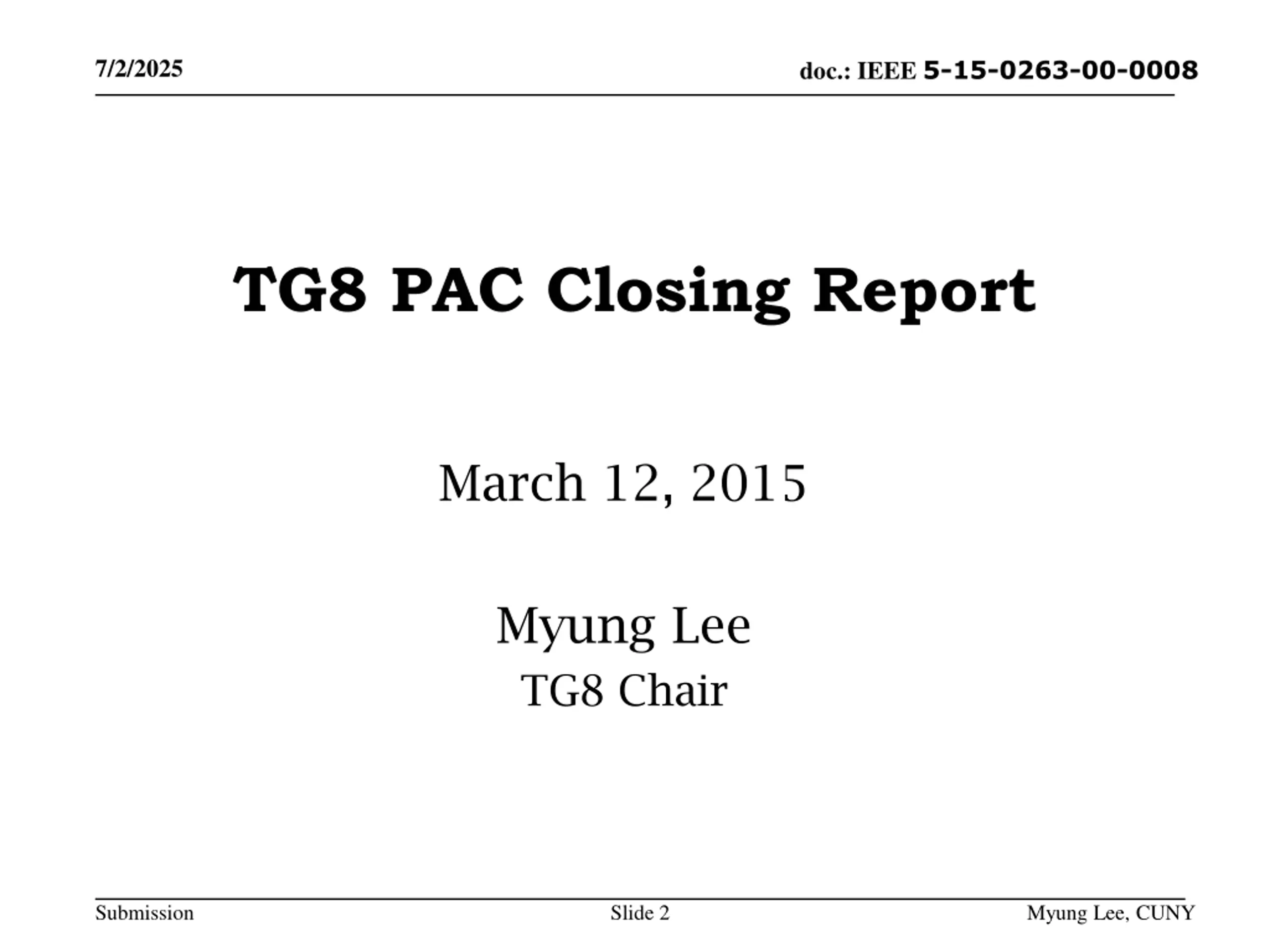 7/2/2025 doc.: IEEE 5-15-0263-00-0008 TG8 PAC Closing Report March 12, 2015 Myung Lee TG8 Chair Submission Slide 2 Myung Lee, CUNY