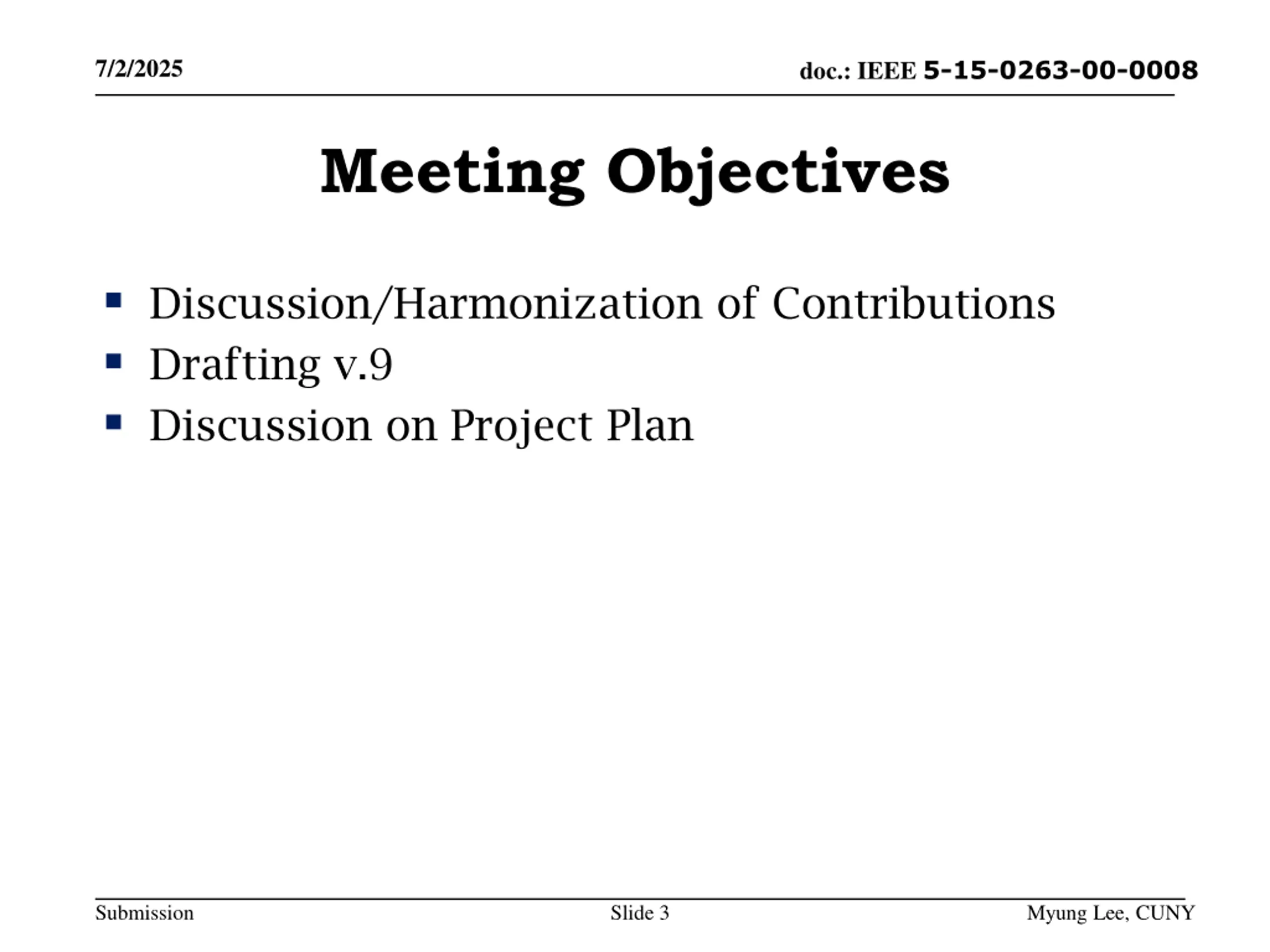 7/2/2025 doc.: IEEE 5-15-0263-00-0008 Meeting Objectives Discussion/Harmonization of Contributions Drafting v.9 Discussion on Project Plan Submission Slide 3 Myung Lee, CUNY