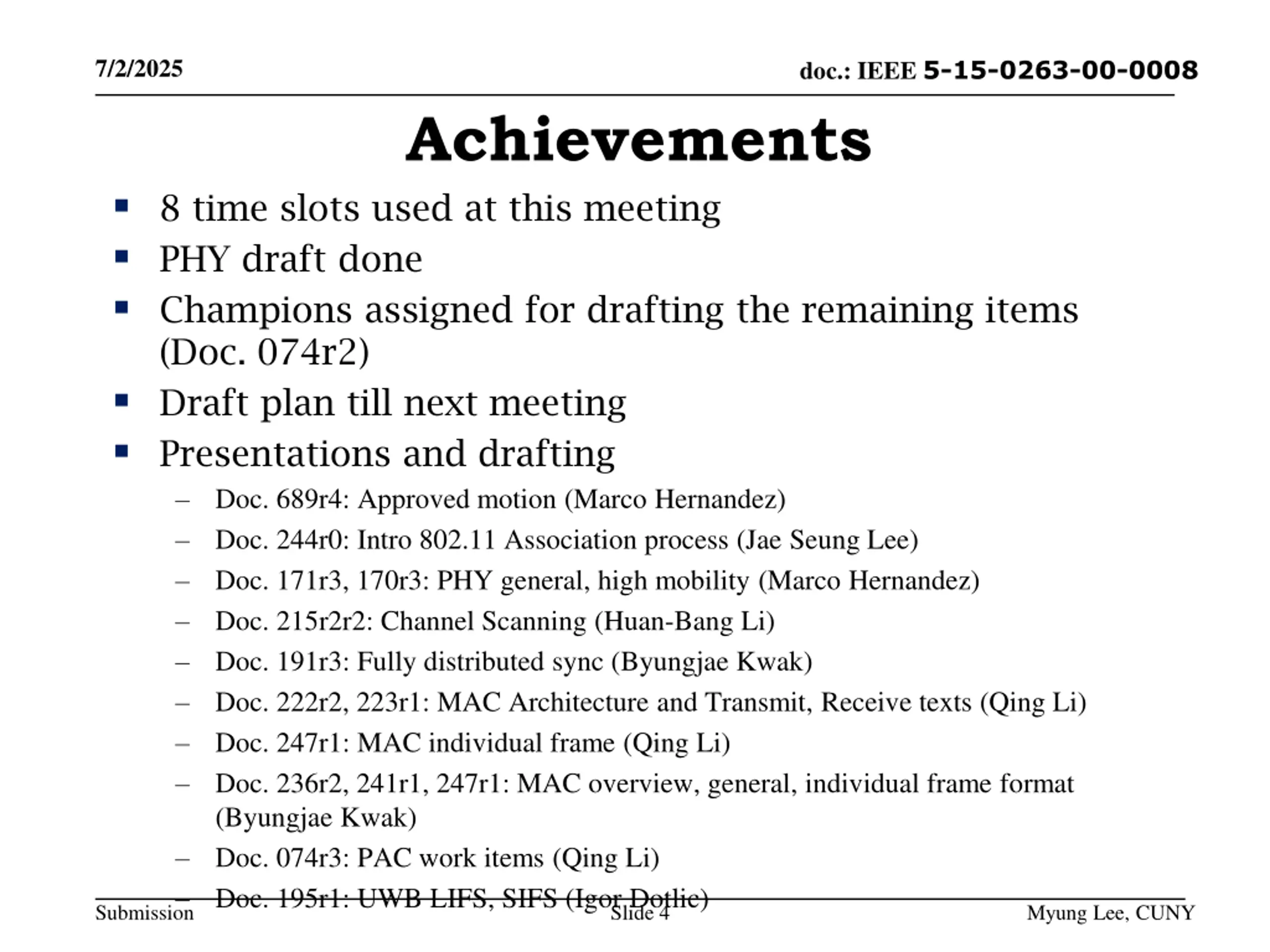 7/2/2025 doc.: IEEE 5-15-0263-00-0008 Achievements 8 time slots used at this meeting PHY draft done Champions assigned for drafting the remaining items (Doc. 074r2) Draft plan till next meeting Presentations and drafting Doc. 689r4: Approved motion (Marco Hernandez) Doc. 244r0: Intro 802.11 Association process (Jae Seung Lee) Doc. 171r3, 170r3: PHY general, high mobility (Marco Hernandez) Doc. 215r2r2: Channel Scanning (Huan-Bang Li) Doc. 191r3: Fully distributed sync (Byungjae Kwak) Doc. 222r2, 223r1: MAC Architecture and Transmit, Receive texts (Qing Li) Doc. 247r1: MAC individual frame (Qing Li) Doc. 236r2, 241r1, 247r1: MAC overview, general, individual frame format (Byungjae Kwak) Doc. 074r3: PAC work items (Qing Li) Doc. 195r1: UWB LIFS, SIFS (Igor Dotlic) Submission Slide 4 Myung Lee, CUNY
