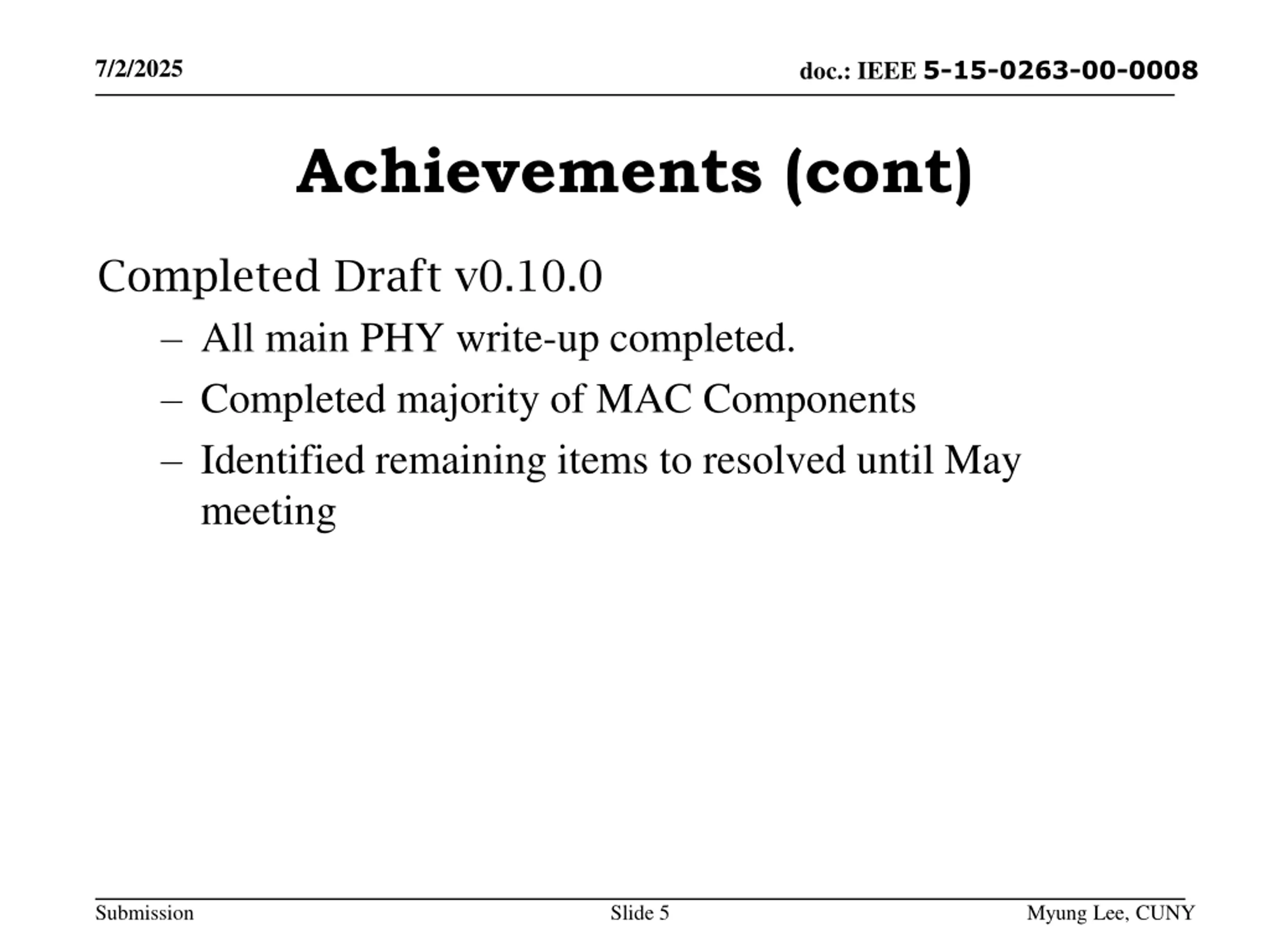 7/2/2025 doc.: IEEE 5-15-0263-00-0008 Achievements (cont) Completed Draft v0.10.0 All main PHY write-up completed. Completed majority of MAC Components Identified remaining items to resolved until May meeting Submission Slide 5 Myung Lee, CUNY