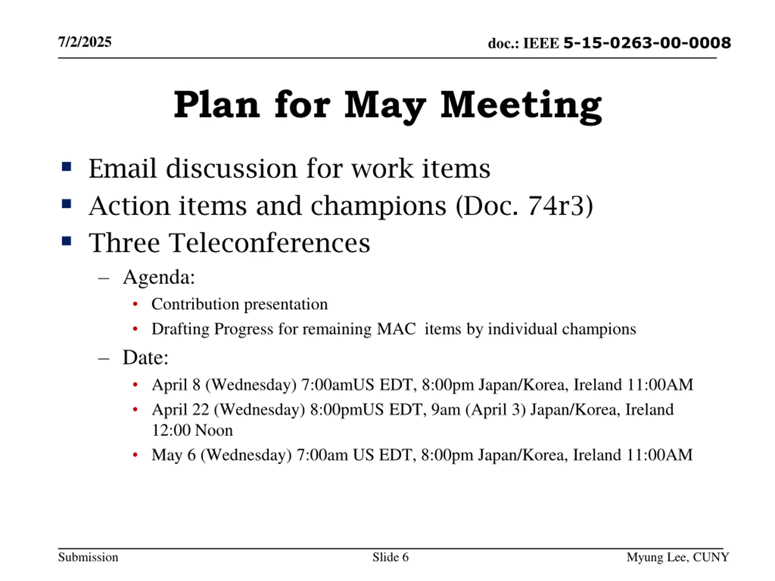 7/2/2025 doc.: IEEE 5-15-0263-00-0008 Plan for May Meeting Email discussion for work items Action items and champions (Doc. 74r3) Three Teleconferences Agenda: Contribution presentation Drafting Progress for remaining MAC items by individual champions Date: April 8 (Wednesday) 7:00amUS EDT, 8:00pm Japan/Korea, Ireland 11:00AM April 22 (Wednesday) 8:00pmUS EDT, 9am (April 3) Japan/Korea, Ireland 12:00 Noon May 6 (Wednesday) 7:00am US EDT, 8:00pm Japan/Korea, Ireland 11:00AM Submission Slide 6 Myung Lee, CUNY