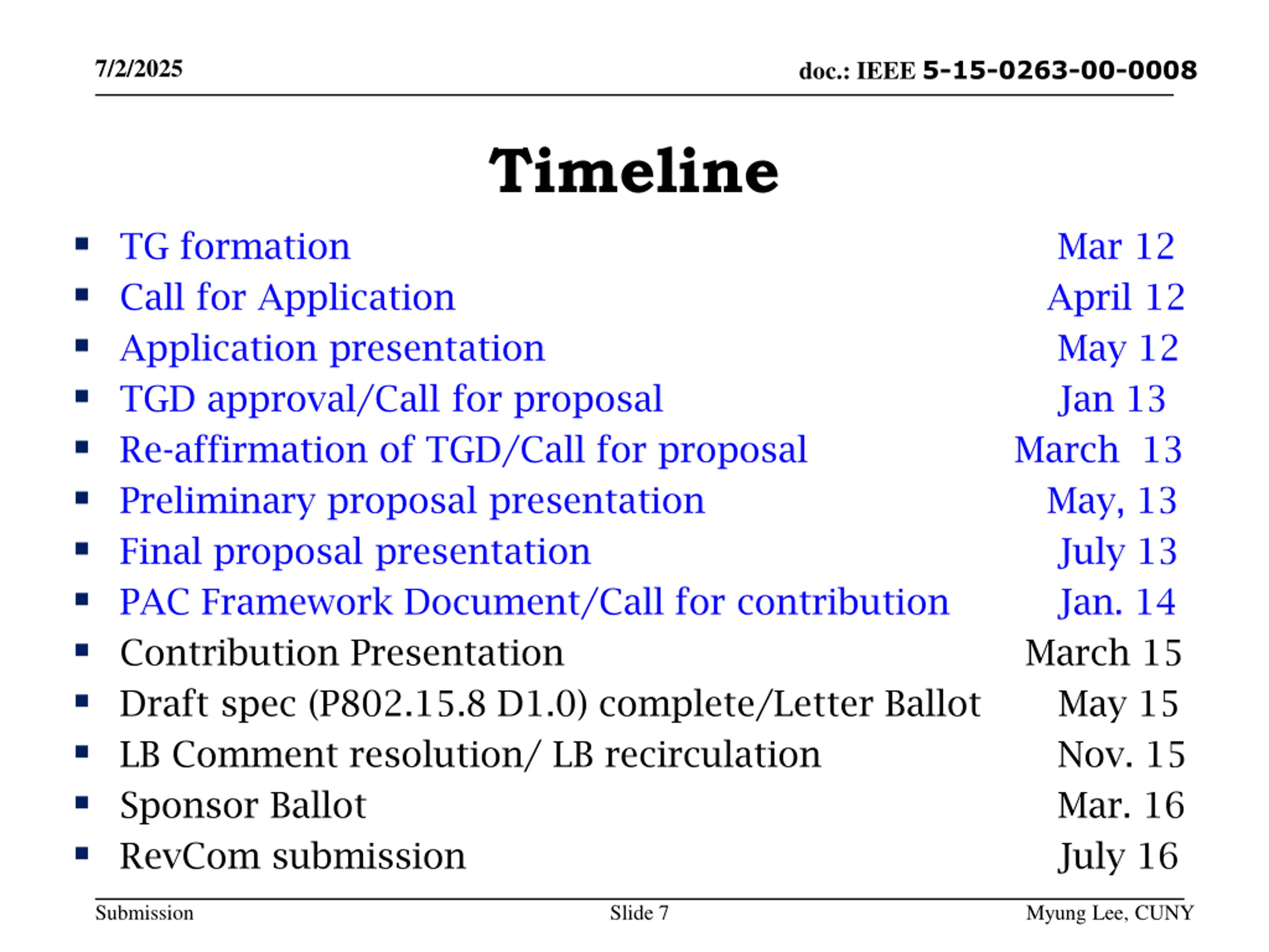 7/2/2025 doc.: IEEE 5-15-0263-00-0008 Timeline TG formation Call for Application Application presentation TGD approval/Call for proposal Re-affirmation of TGD/Call for proposal Preliminary proposal presentation Final proposal presentation PAC Framework Document/Call for contribution Jan. 14 Contribution Presentation Draft spec (P802.15.8 D1.0) complete/Letter Ballot May 15 LB Comment resolution/ LB recirculation Sponsor Ballot RevCom submission Mar 12 April 12 May 12 Jan 13 March 13 May, 13 July 13 March 15 Nov. 15 Mar. 16 July 16 Submission Slide 7 Myung Lee, CUNY
