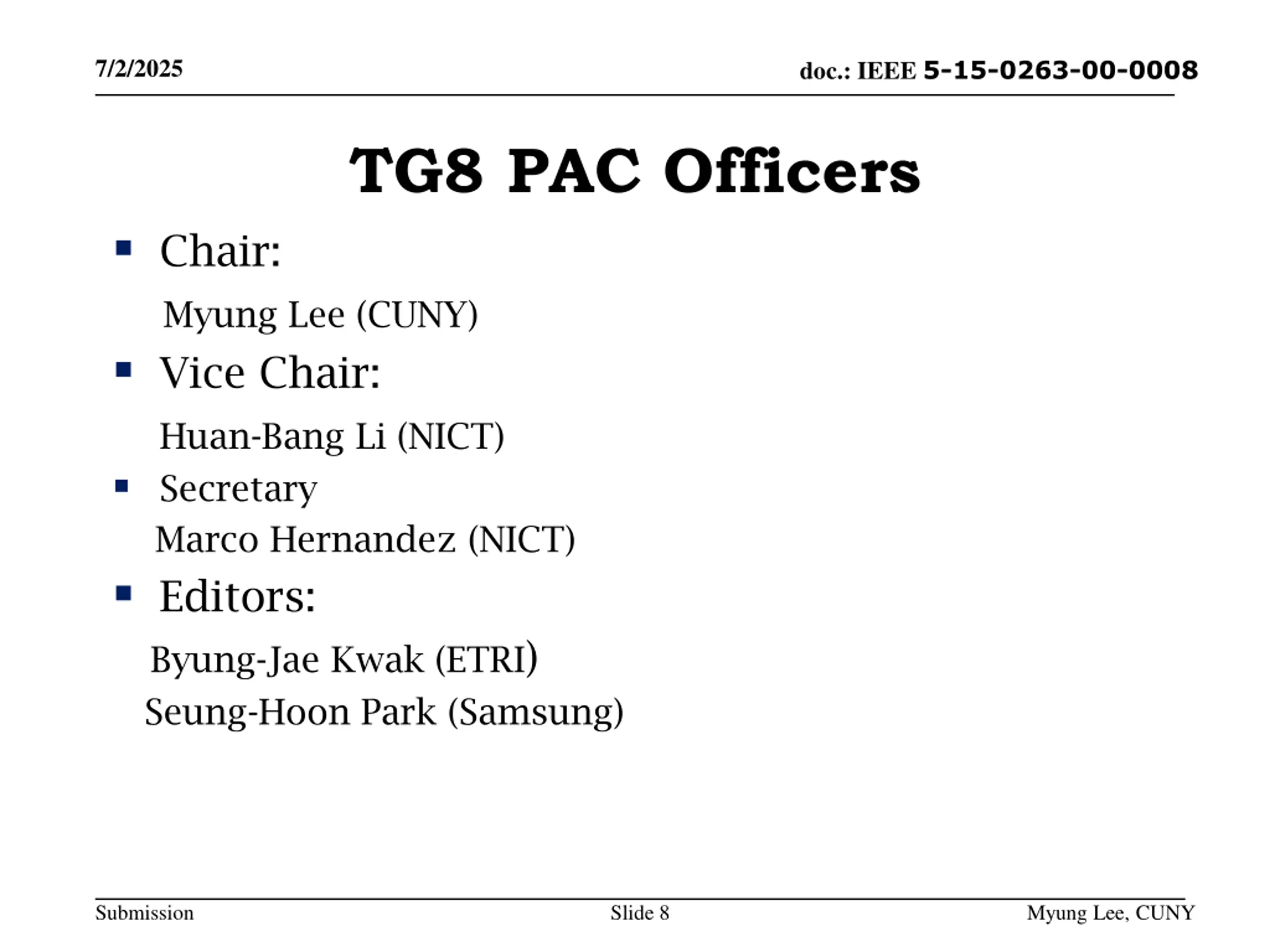 7/2/2025 doc.: IEEE 5-15-0263-00-0008 TG8 PAC Officers Chair: Myung Lee (CUNY) Vice Chair: Huan-Bang Li (NICT) Secretary Marco Hernandez (NICT) Editors: Byung-Jae Kwak (ETRI) Seung-Hoon Park (Samsung) Submission Slide 8 Myung Lee, CUNY