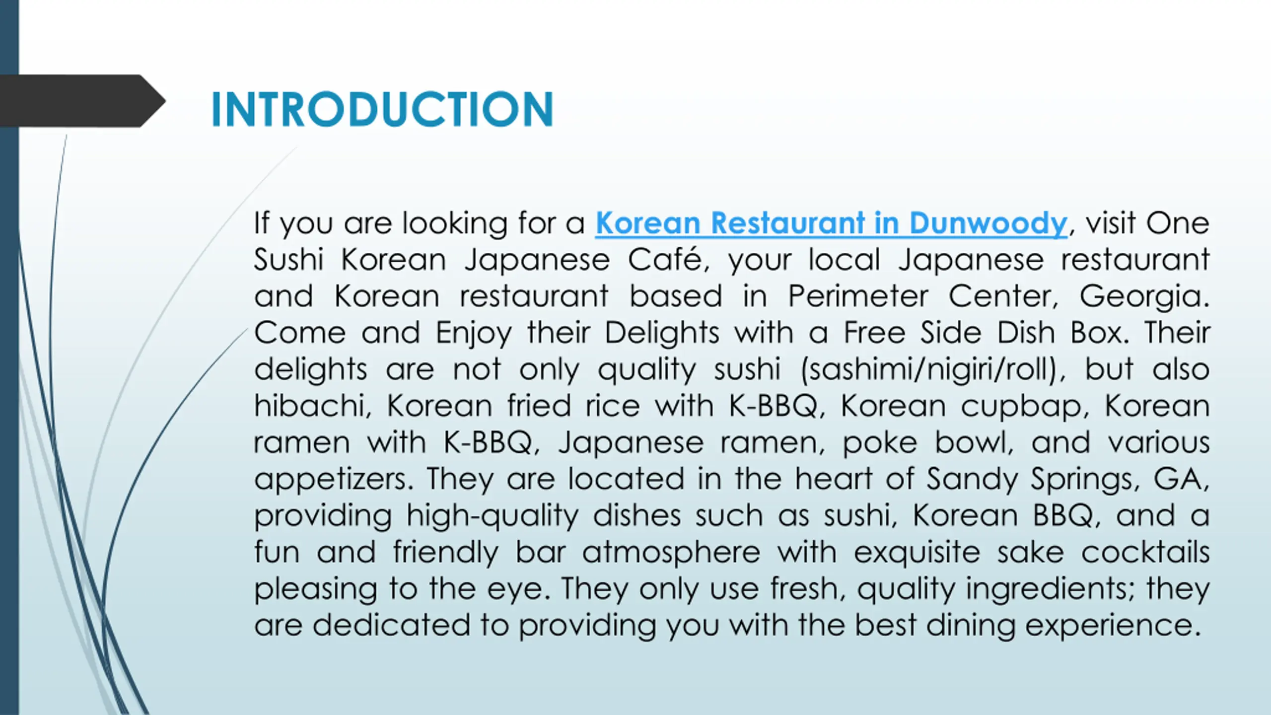 INTRODUCTION If you are looking for a Korean Restaurant in Dunwoody, visit One Sushi Korean Japanese Caf , your local Japanese restaurant and Korean restaurant based in Perimeter Center, Georgia. Come and Enjoy their Delights with a Free Side Dish Box. Their delights are not only quality sushi (sashimi/nigiri/roll), but also hibachi, Korean fried rice with K-BBQ, Korean cupbap, Korean ramen with K-BBQ, Japanese ramen, poke bowl, and various appetizers. They are located in the heart of Sandy Springs, GA, providing high-quality dishes such as sushi, Korean BBQ, and a fun and friendly bar atmosphere with exquisite sake cocktails pleasing to the eye. They only use fresh, quality ingredients; they are dedicated to providing you with the best dining experience.