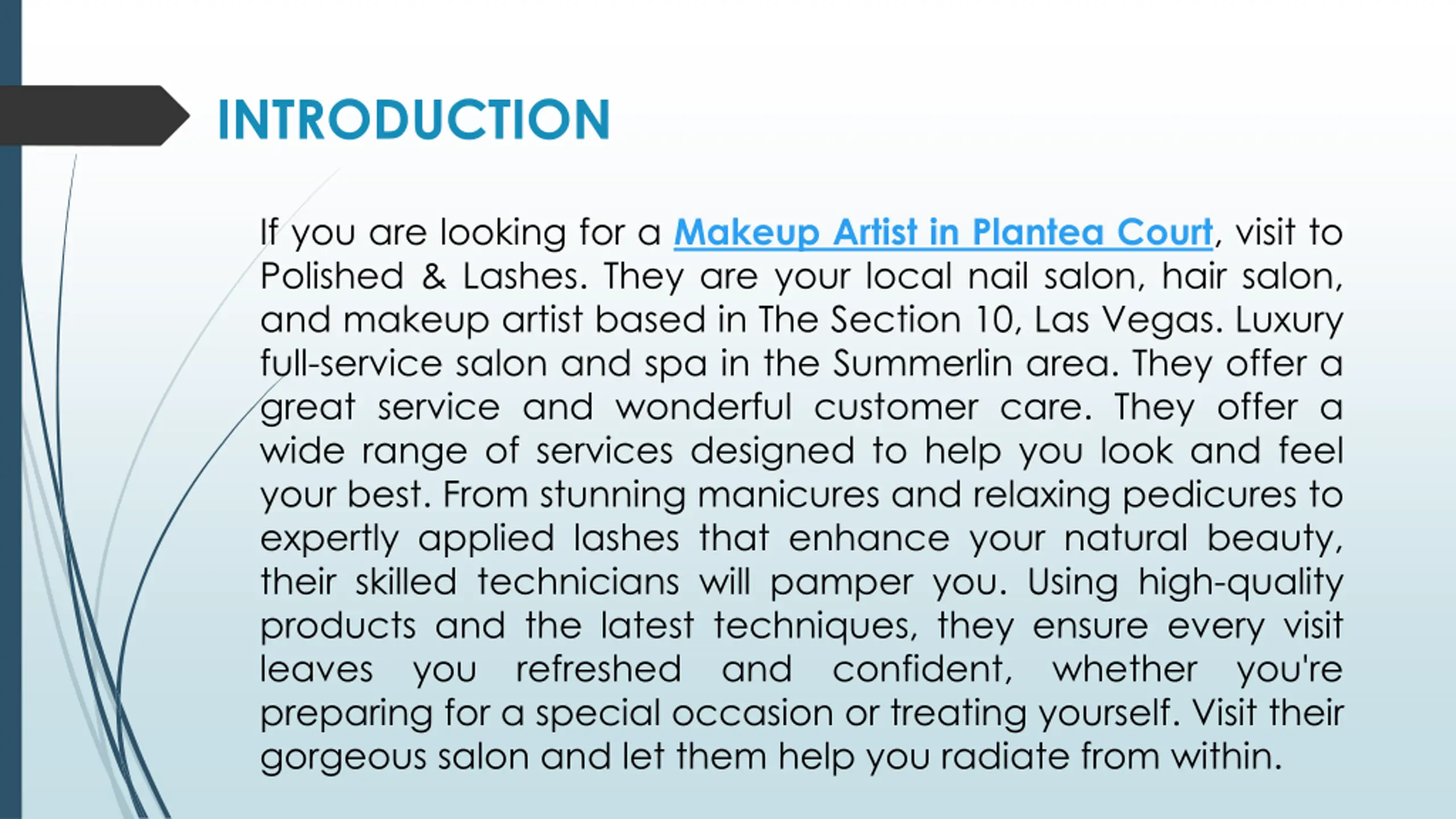 INTRODUCTION If you are looking for a Makeup Artist in Plantea Court, visit to Polished & Lashes. They are your local nail salon, hair salon, and makeup artist based in The Section 10, Las Vegas. Luxury full-service salon and spa in the Summerlin area. They offer a great service and wonderful customer care. They offer a wide range of services designed to help you look and feel your best. From stunning manicures and relaxing pedicures to expertly applied lashes that enhance your natural beauty, their skilled technicians will pamper you. Using high-quality products and the latest techniques, they ensure every visit leaves you refreshed and confident, whether you're preparing for a special occasion or treating yourself. Visit their gorgeous salon and let them help you radiate from within.