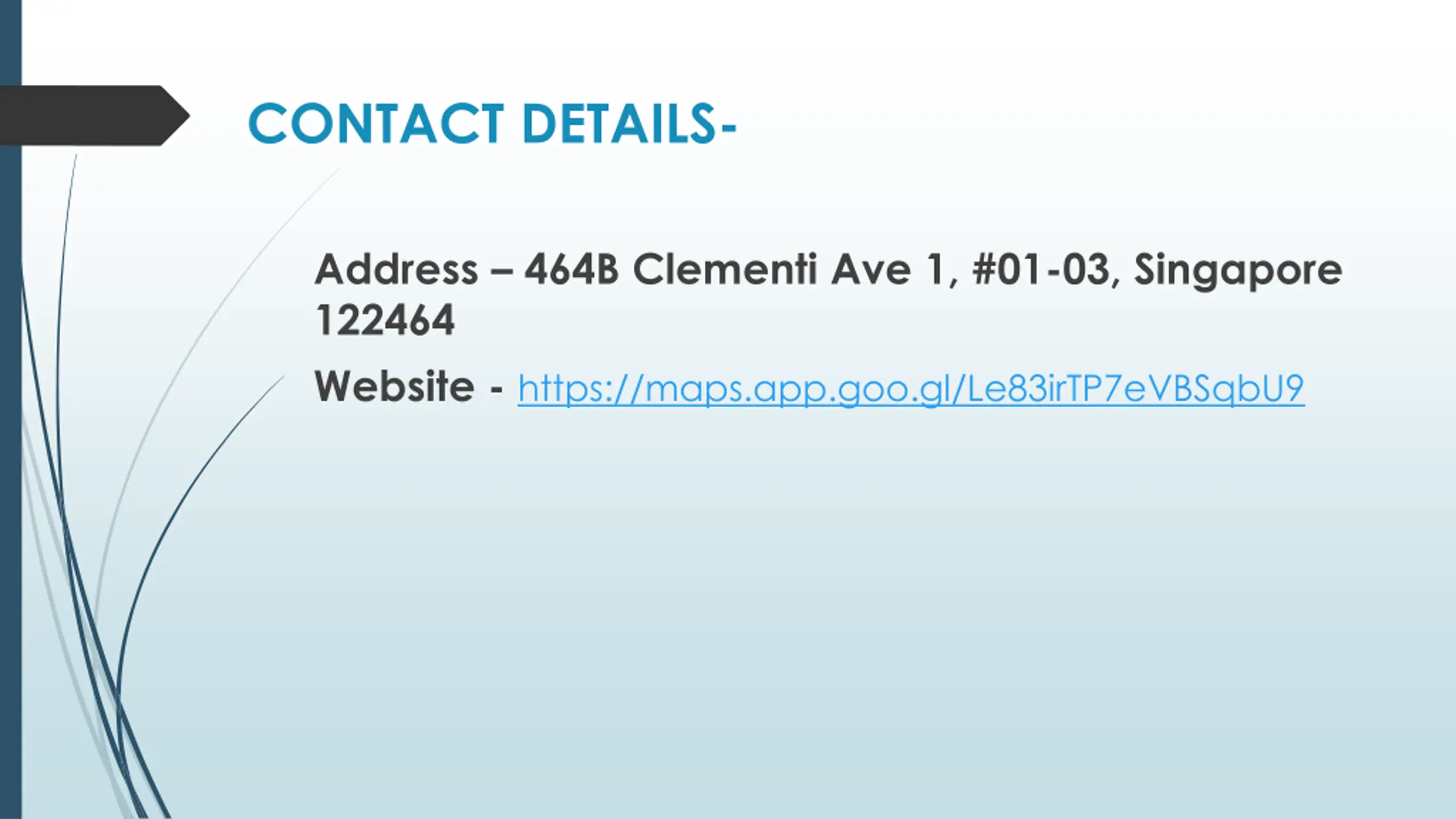CONTACT DETAILS- Address 464B Clementi Ave 1, #01-03, Singapore 122464 Website - https://maps.app.goo.gl/Le83irTP7eVBSqbU9