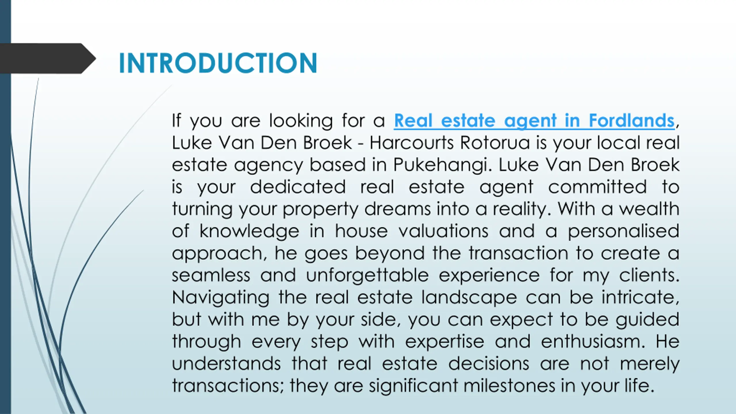 INTRODUCTION If you are looking for a Real estate agent in Fordlands, Luke Van Den Broek - Harcourts Rotorua is your local real estate agency based in Pukehangi. Luke Van Den Broek is your dedicated real estate agent committed to turning your property dreams into a reality. With a wealth of knowledge in house valuations and a personalised approach, he goes beyond the transaction to create a seamless and unforgettable experience for my clients. Navigating the real estate landscape can be intricate, but with me by your side, you can expect to be guided through every step with expertise and enthusiasm. He understands that real estate decisions are not merely transactions; they are significant milestones in your life.