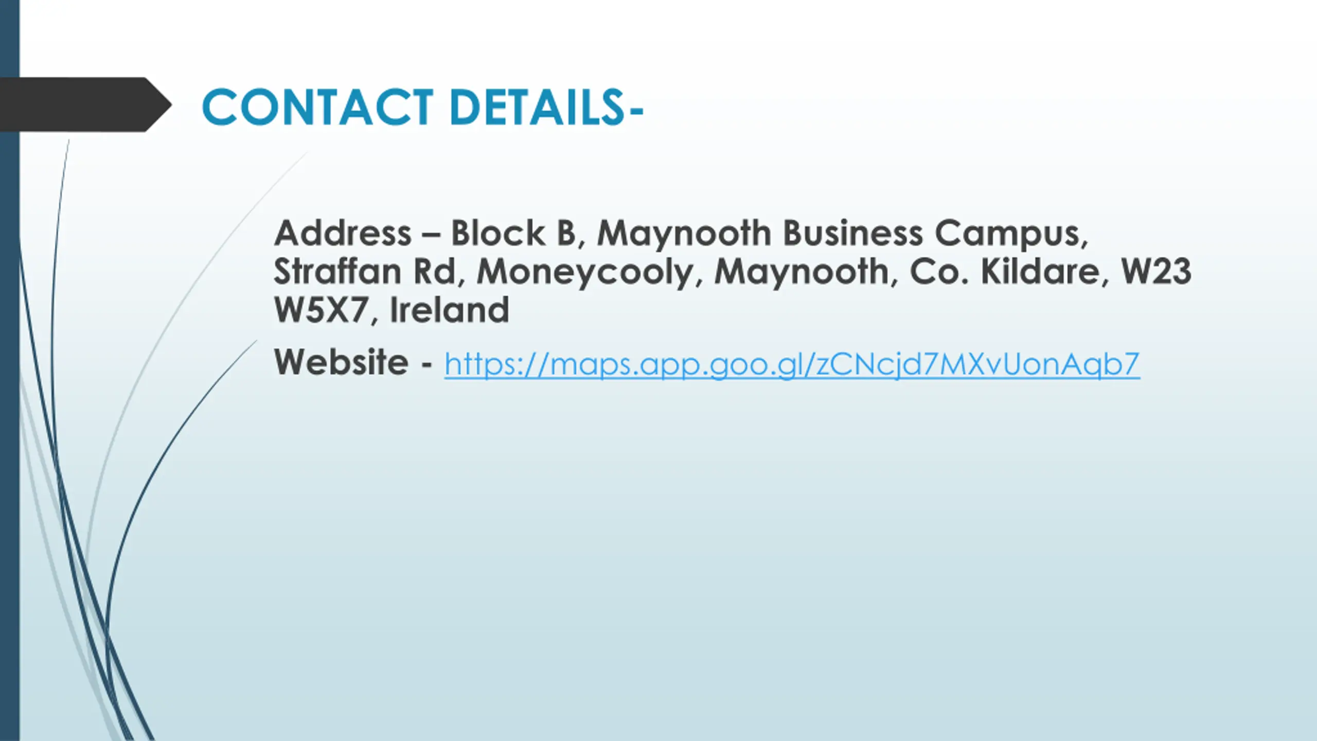 CONTACT DETAILS- Address Block B, Maynooth Business Campus, Straffan Rd, Moneycooly, Maynooth, Co. Kildare, W23 W5X7, Ireland Website - https://maps.app.goo.gl/zCNcjd7MXvUonAqb7