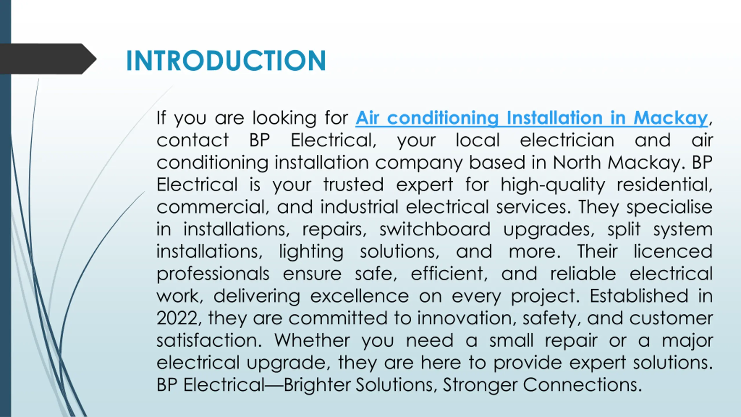 INTRODUCTION If you are looking for Air conditioning Installation in Mackay, contact BP Electrical, your local electrician and air conditioning installation company based in North Mackay. BP Electrical is your trusted expert for high-quality residential, commercial, and industrial electrical services. They specialise in installations, repairs, switchboard upgrades, split system installations, lighting solutions, and more. Their licenced professionals ensure safe, efficient, and reliable electrical work, delivering excellence on every project. Established in 2022, they are committed to innovation, safety, and customer satisfaction. Whether you need a small repair or a major electrical upgrade, they are here to provide expert solutions. BP Electrical Brighter Solutions, Stronger Connections. If you are looking for Air conditioning Installation in Mackay, contact BP Electrical, your local electrician and air conditioning installation company based in North Mackay. BP Electrical is your trusted expert for high-quality residential, commercial, and industrial electrical services. They specialise in installations, repairs, switchboard upgrades, split system installations, lighting solutions, and more. Their licenced professionals ensure safe, efficient, and reliable electrical work, delivering excellence on every project. Established in 2022, they are committed to innovation, safety, and customer satisfaction. Whether you need a small repair or a major electrical upgrade, they are here to provide expert solutions. BP Electrical Brighter Solutions, Stronger Connections.