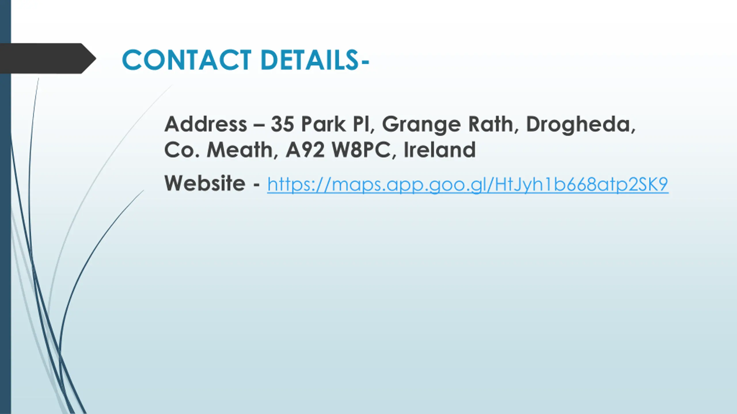 CONTACT DETAILS- Address 35 Park Pl, Grange Rath, Drogheda, Co. Meath, A92 W8PC, Ireland Website - https://maps.app.goo.gl/HtJyh1b668atp2SK9