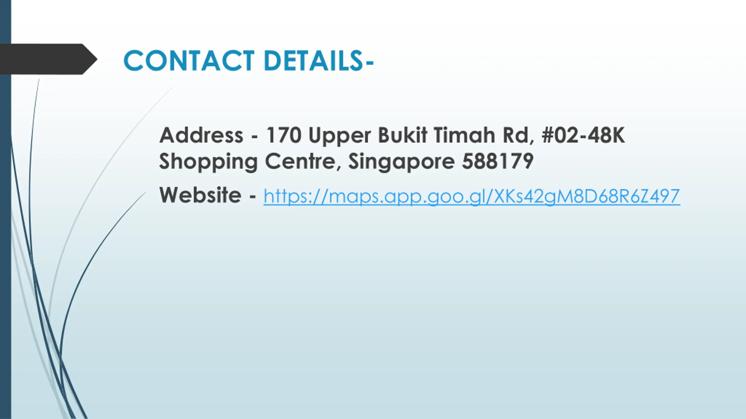 CONTACT DETAILS- Address - 170 Upper Bukit Timah Rd, #02-48K Shopping Centre, Singapore 588179 Website - https://maps.app.goo.gl/XKs42gM8D68R6Z497