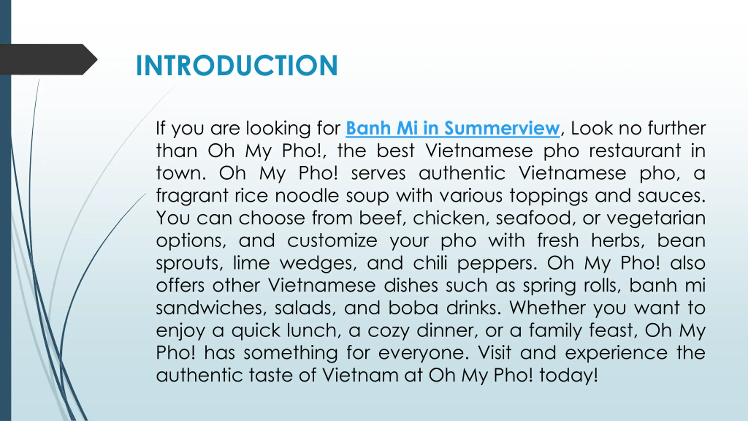 INTRODUCTION If you are looking for Banh Mi in Summerview, Look no further than Oh My Pho!, the best Vietnamese pho restaurant in town. Oh My Pho! serves authentic Vietnamese pho, a fragrant rice noodle soup with various toppings and sauces. You can choose from beef, chicken, seafood, or vegetarian options, and customize your pho with fresh herbs, bean sprouts, lime wedges, and chili peppers. Oh My Pho! also offers other Vietnamese dishes such as spring rolls, banh mi sandwiches, salads, and boba drinks. Whether you want to enjoy a quick lunch, a cozy dinner, or a family feast, Oh My Pho! has something for everyone. Visit and experience the authentic taste of Vietnam at Oh My Pho! today! If you are looking for Banh Mi in Summerview, Look no further than Oh My Pho!, the best Vietnamese pho restaurant in town. Oh My Pho! serves authentic Vietnamese pho, a fragrant rice noodle soup with various toppings and sauces. You can choose from beef, chicken, seafood, or vegetarian options, and customize your pho with fresh herbs, bean sprouts, lime wedges, and chili peppers. Oh My Pho! also offers other Vietnamese dishes such as spring rolls, banh mi sandwiches, salads, and boba drinks. Whether you want to enjoy a quick lunch, a cozy dinner, or a family feast, Oh My Pho! has something for everyone. Visit and experience the authentic taste of Vietnam at Oh My Pho! today!