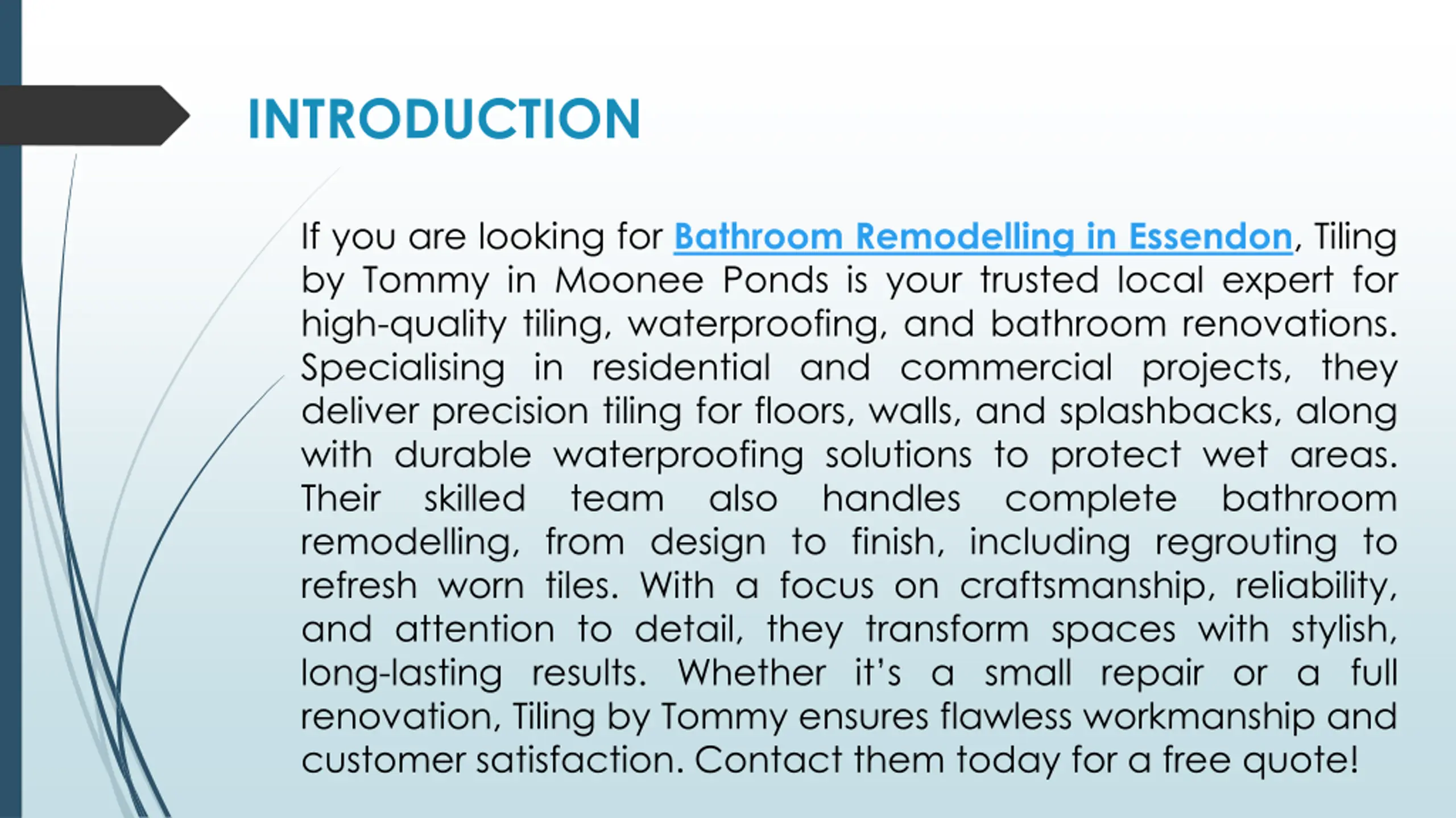 INTRODUCTION If you are looking for Bathroom Remodelling in Essendon, Tiling by Tommy in Moonee Ponds is your trusted local expert for high-quality tiling, waterproofing, and bathroom renovations. Specialising in residential and commercial projects, they deliver precision tiling for floors, walls, and splashbacks, along with durable waterproofing solutions to protect wet areas. Their skilled team also handles complete bathroom remodelling, from design to finish, including regrouting to refresh worn tiles. With a focus on craftsmanship, reliability, and attention to detail, they transform spaces with stylish, long-lasting results. Whether it s a small repair or a full renovation, Tiling by Tommy ensures flawless workmanship and customer satisfaction. Contact them today for a free quote! If you are looking for Bathroom Remodelling in Essendon, Tiling by Tommy in Moonee Ponds is your trusted local expert for high-quality tiling, waterproofing, and bathroom renovations. Specialising in residential and commercial projects, they deliver precision tiling for floors, walls, and splashbacks, along with durable waterproofing solutions to protect wet areas. Their skilled team also handles remodelling, from design to finish, including regrouting to refresh worn tiles. With a focus on craftsmanship, reliability, and attention to detail, they transform spaces with stylish, long-lasting results. Whether it s a small repair or a full renovation, Tiling by Tommy ensures flawless workmanship and customer satisfaction. Contact them today for a free quote! complete bathroom