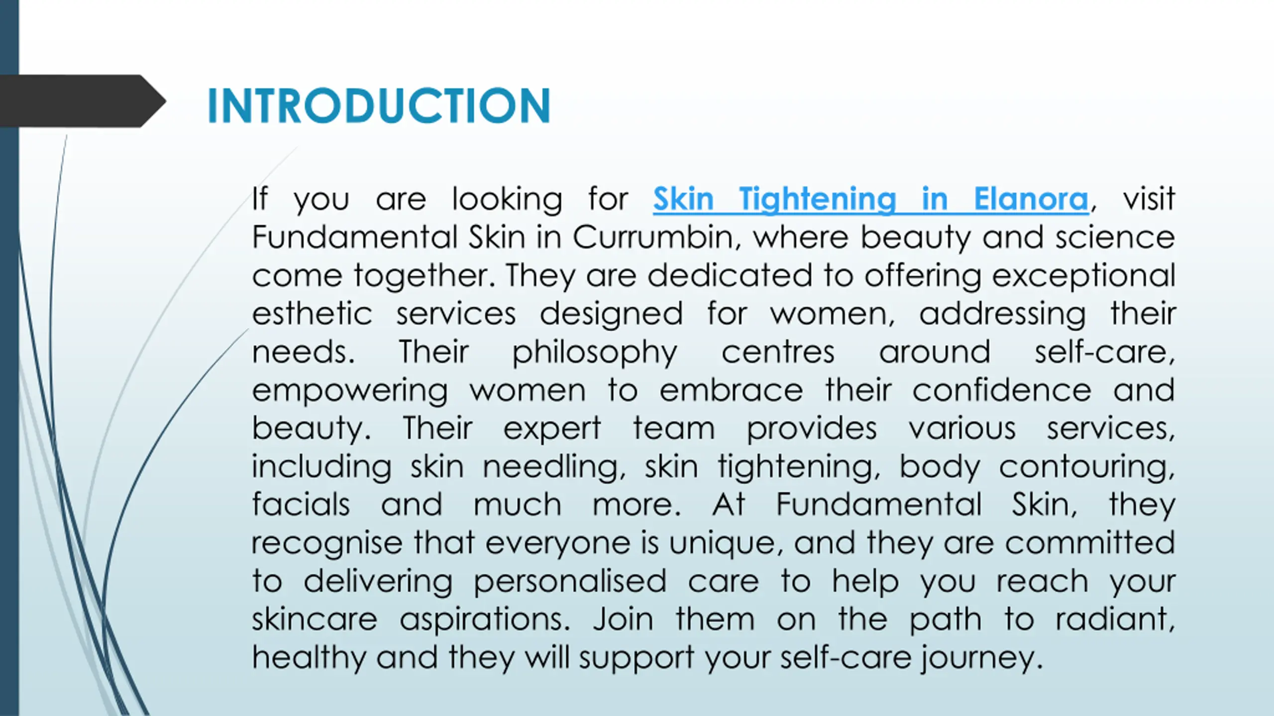 INTRODUCTION If you are looking for Skin Tightening in Elanora, visit Fundamental Skin in Currumbin, where beauty and science come together. They are dedicated to offering exceptional esthetic services designed for women, addressing their needs. Their philosophy empowering women to embrace their confidence and beauty. Their expert team provides various services, including skin needling, skin tightening, body contouring, facials and much more. At Fundamental Skin, they recognise that everyone is unique, and they are committed to delivering personalised care to help you reach your skincare aspirations. Join them on the path to radiant, healthy and they will support your self-care journey. centres around self-care,