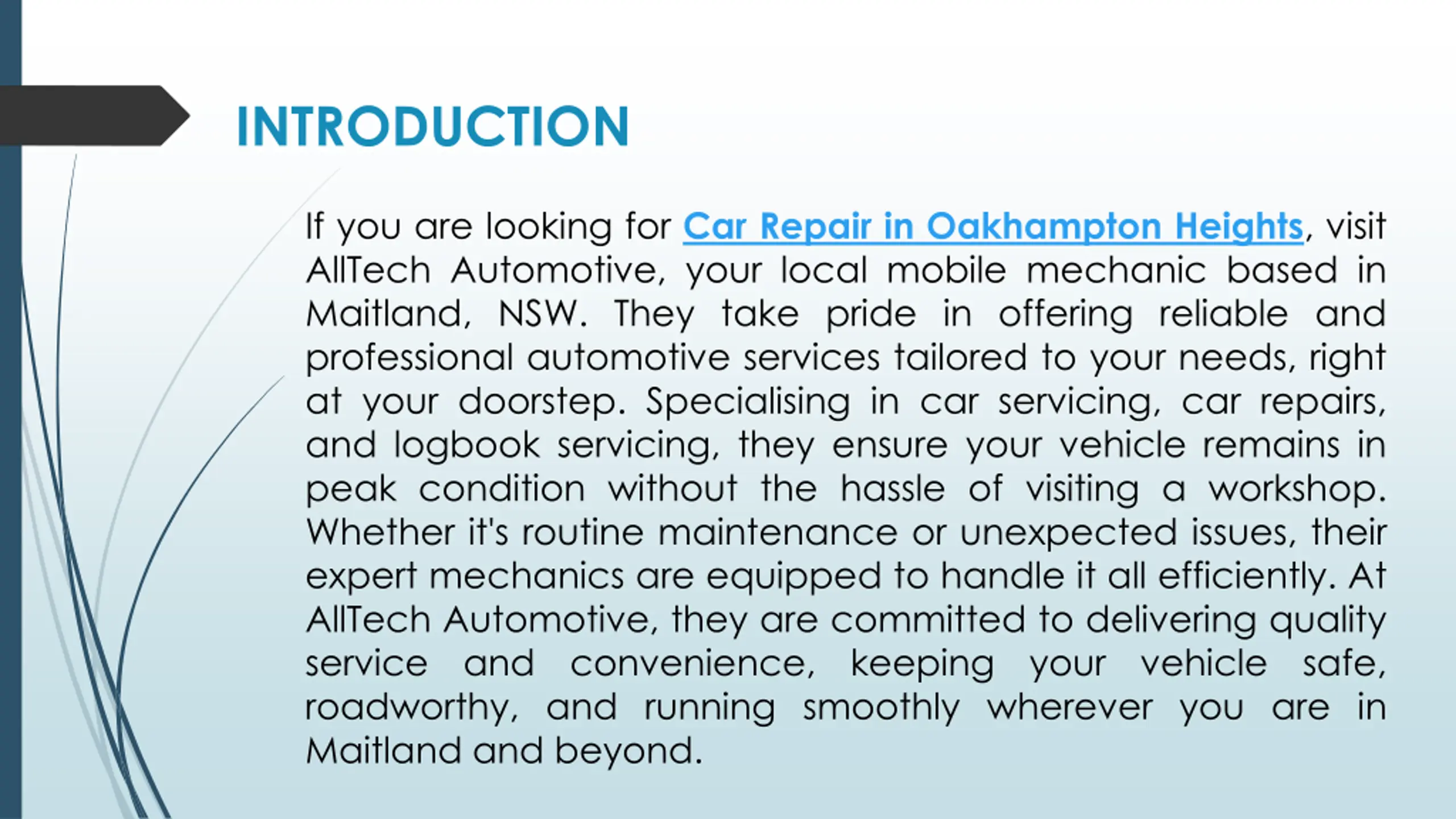 INTRODUCTION If you are looking for Car Repair in Oakhampton Heights, visit AllTech Automotive, your local mobile mechanic based in Maitland, NSW. They take pride in offering reliable and professional automotive services tailored to your needs, right at your doorstep. Specialising in car servicing, car repairs, and logbook servicing, they ensure your vehicle remains in peak condition without the hassle of visiting a workshop. Whether it's routine maintenance or unexpected issues, their expert mechanics are equipped to handle it all efficiently. At AllTech Automotive, they are committed to delivering quality service and convenience, keeping your vehicle safe, roadworthy, and running smoothly wherever you are in Maitland and beyond. If you are looking for Car Repair in Oakhampton Heights, visit AllTech Automotive, your local mobile mechanic based in Maitland, NSW. They take pride in offering reliable and professional automotive services tailored to your needs, right at your doorstep. Specialising in car servicing, car repairs, and logbook servicing, they ensure your vehicle remains in peak condition without the hassle of visiting a workshop. Whether it's routine maintenance or unexpected issues, their expert mechanics are equipped to handle it all efficiently. At AllTech Automotive, they are committed to delivering quality service and convenience, keeping your vehicle safe, roadworthy, and running smoothly wherever you are in Maitland and beyond.
