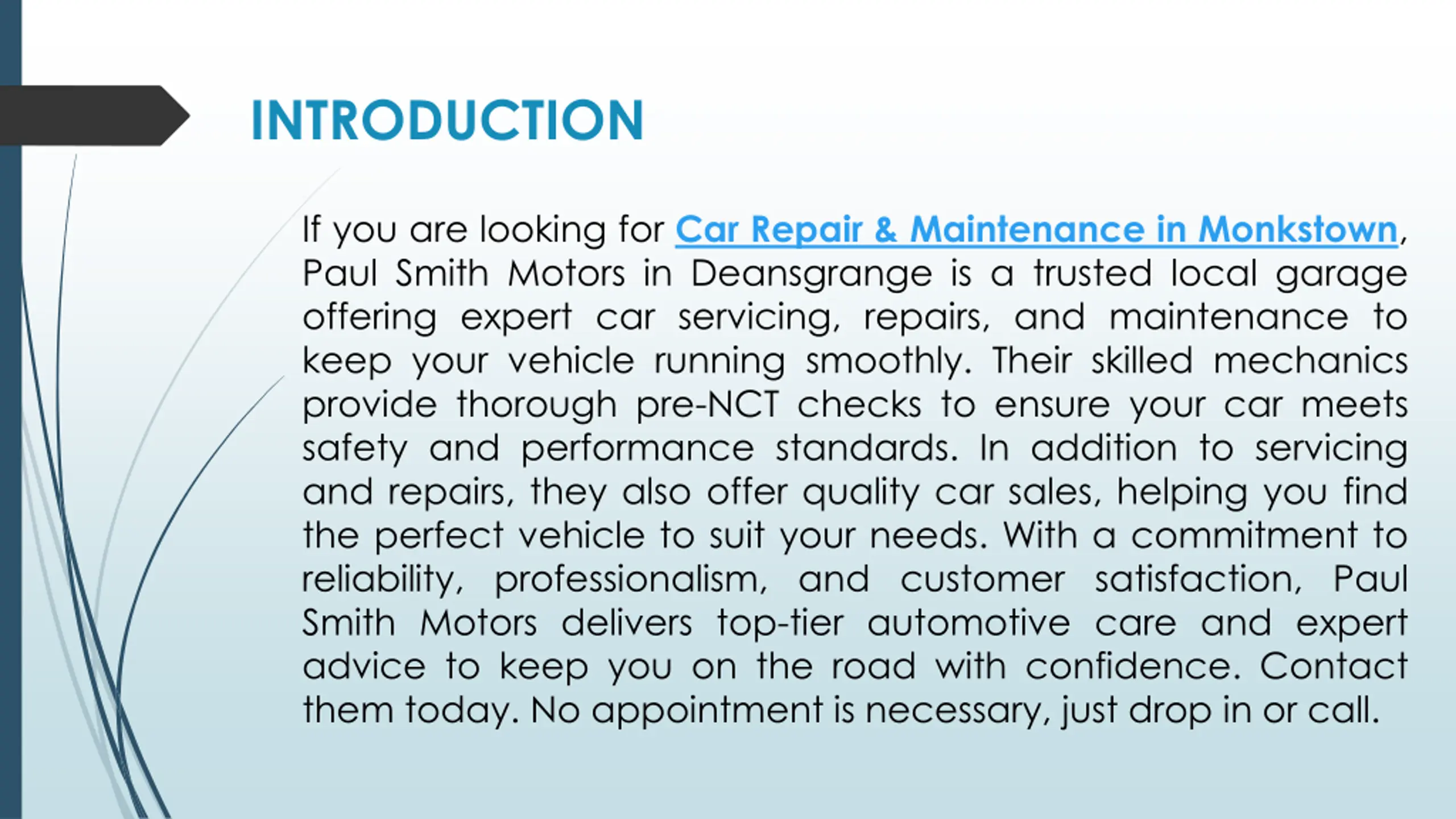 INTRODUCTION If you are looking for Car Repair Maintenance in Monkstown, Paul Smith Motors in Deansgrange is a trusted local garage offering expert car servicing, repairs, and maintenance to keep your vehicle running smoothly. Their skilled mechanics provide thorough pre-NCT checks to ensure your car meets safety and performance standards. In addition to servicing and repairs, they also offer quality car sales, helping you find the perfect vehicle to suit your needs. With a commitment to reliability, professionalism, and customer satisfaction, Paul Smith Motors delivers top-tier automotive care and expert advice to keep you on the road with confidence. Contact them today. No appointment is necessary, just drop in or call. If you are looking for Car Repair & Maintenance in Monkstown, Paul Smith Motors in Deansgrange is a trusted local garage offering expert car servicing, repairs, and maintenance to keep your vehicle running smoothly. Their skilled mechanics provide thorough pre-NCT checks to ensure your car meets safety and performance standards. In addition to servicing and repairs, they also offer quality car sales, helping you find the perfect vehicle to suit your needs. With a commitment to reliability, professionalism, and customer satisfaction, Paul Smith Motors delivers top-tier automotive care and expert advice to keep you on the road with confidence. Contact them today. No appointment is necessary, just drop in or call.