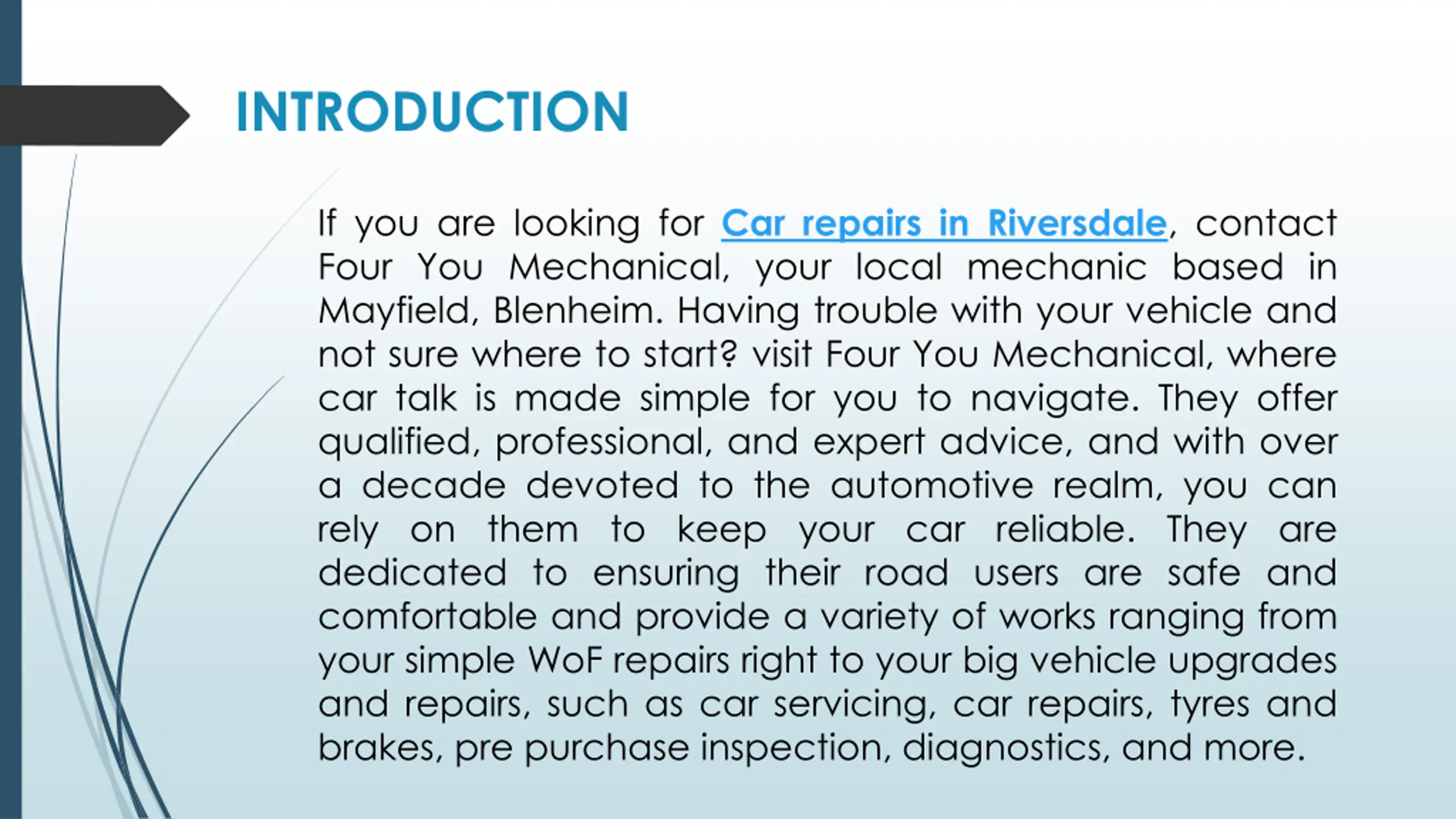 INTRODUCTION If you are looking for Car repairs in Riversdale, contact Four You Mechanical, your local mechanic based in Mayfield, Blenheim. Having trouble with your vehicle and not sure where to start? visit Four You Mechanical, where car talk is made simple for you to navigate. They offer qualified, professional, and expert advice, and with over a decade devoted to the automotive realm, you can rely on them to keep your car reliable. They are dedicated to ensuring their road users are safe and comfortable and provide a variety of works ranging from your simple WoF repairs right to your big vehicle upgrades and repairs, such as car servicing, car repairs, tyres and brakes, pre purchase inspection, diagnostics, and more.