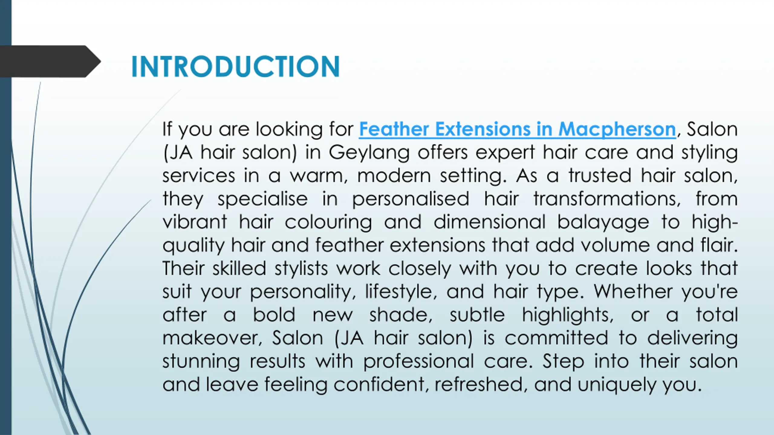 INTRODUCTION If you are looking for Feather Extensions in Macpherson, Salon (JA hair salon) in Geylang offers expert hair care and styling services in a warm, modern setting. As a trusted hair salon, they specialise in personalised hair transformations, from vibrant hair colouring and dimensional balayage to high-quality hair and feather extensions that add volume and flair. Their skilled stylists work closely with you to create looks that suit your personality, lifestyle, and hair type. Whether you're after a bold new shade, subtle highlights, or a total makeover, Salon (JA hair salon) is committed to delivering stunning results with professional care. Step into their salon and leave feeling confident, refreshed, and uniquely you. If you are looking for Feather Extensions in Macpherson, Salon (JA hair salon) in Geylang offers expert hair care and styling services in a warm, modern setting. As a trusted hair salon, they specialise in personalised hair transformations, from vibrant hair colouring and dimensional balayage to high- quality hair and feather extensions that add volume and flair. Their skilled stylists work closely with you to create looks that suit your personality, lifestyle, and hair type. Whether you're after a bold new shade, subtle highlights, or a total makeover, Salon (JA hair salon) is committed to delivering stunning results with professional care. Step into their salon and leave feeling confident, refreshed, and uniquely you.