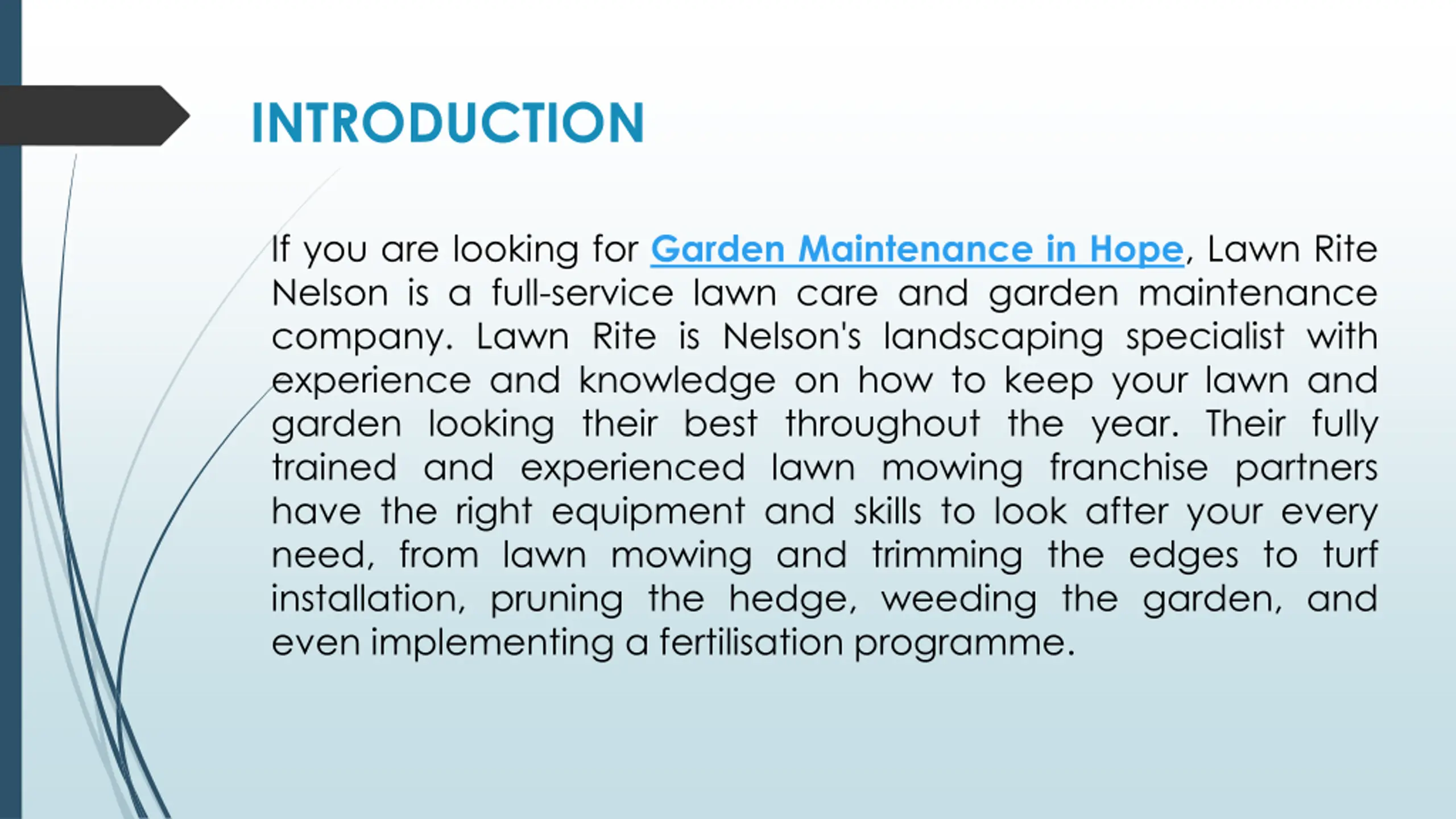 INTRODUCTION If you are looking for Garden Maintenance in Hope, Lawn Rite Nelson is a full-service lawn care and garden maintenance company. Lawn Rite is Nelson's landscaping specialist with experience and knowledge on how to keep your lawn and garden looking their best throughout the year. Their fully trained and experienced lawn mowing franchise partners have the right equipment and skills to look after your every need, from lawn mowing and trimming the edges to turf installation, pruning the hedge, weeding the garden, and even implementing a fertilisation programme.