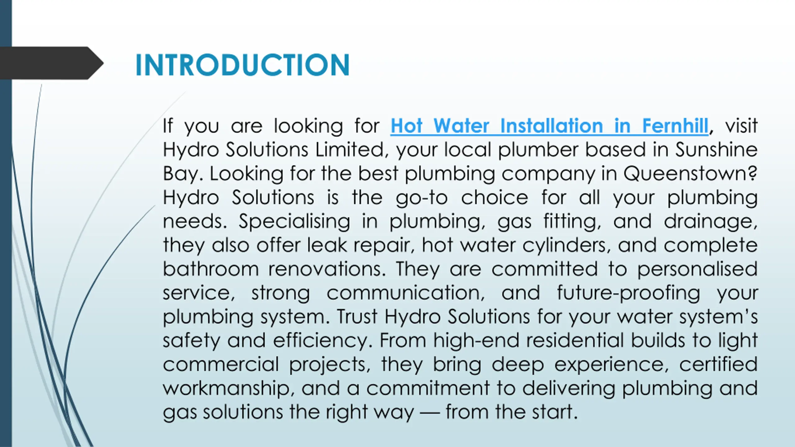 INTRODUCTION If you are looking for Hot Water Installation in Fernhill, visit Hydro Solutions Limited, your local plumber based in Sunshine Bay. Looking for the best plumbing company in Queenstown? Hydro Solutions is the go-to choice for all your plumbing needs. Specialising in plumbing, gas fitting, and drainage, they also offer leak repair, hot water cylinders, and complete bathroom renovations. They are committed to personalised service, strong communication, and future-proofing your plumbing system. Trust Hydro Solutions for your water system s safety and efficiency. From high-end residential builds to light commercial projects, they bring deep experience, certified workmanship, and a commitment to delivering plumbing and gas solutions the right way from the start. If you are looking for Hot Water Installation in Fernhill, visit Hydro Solutions Limited, your local plumber based in Sunshine Bay. Looking for the best plumbing company in Queenstown? Hydro Solutions is the go-to choice for all your plumbing needs. Specialising in plumbing, gas fitting, and drainage, they also offer leak repair, hot water cylinders, and complete bathroom renovations. They are committed to personalised service, strong communication, and future-proofing your plumbing system. Trust Hydro Solutions for your water system s safety and efficiency. From high-end residential builds to light commercial projects, they bring deep experience, certified workmanship, and a commitment to delivering plumbing and gas solutions the right way from the start.