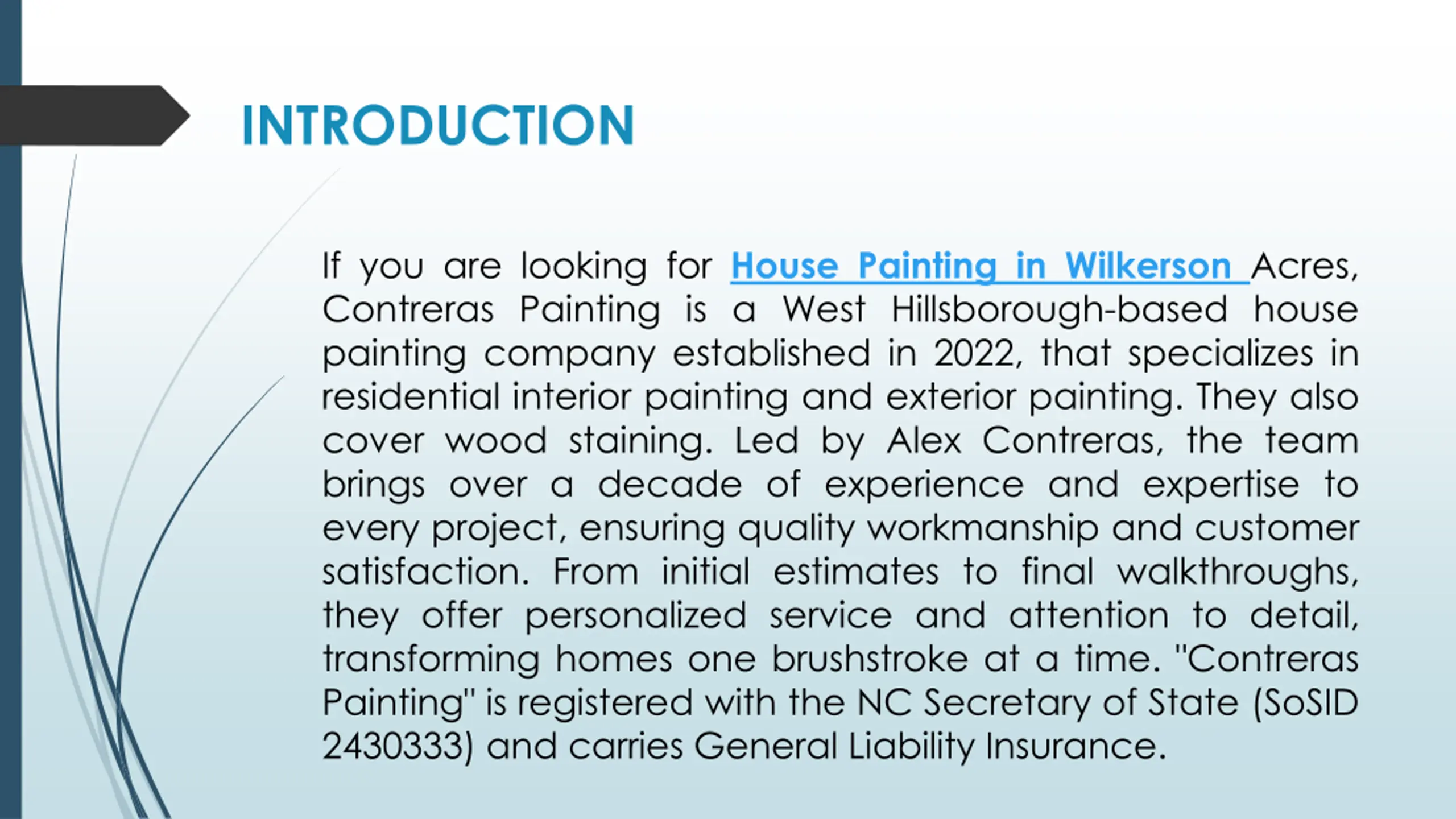 INTRODUCTION If you are looking for House Painting in Wilkerson Acres, Contreras Painting is a West Hillsborough-based house painting company established in 2022, that specializes in residential interior painting and exterior painting. They also cover wood staining. Led by Alex Contreras, the team brings over a decade of experience and expertise to every project, ensuring quality workmanship and customer satisfaction. From initial estimates to final walkthroughs, they offer personalized service and attention to detail, transforming homes one brushstroke at a time. "Contreras Painting" is registered with the NC Secretary of State (SoSID 2430333) and carries General Liability Insurance. If you are looking for House Painting in Wilkerson Acres, Contreras Painting is a West Hillsborough-based house painting company established in 2022, that specializes in residential interior painting and exterior painting. They also cover wood staining. Led by Alex Contreras, the team brings over a decade of experience and expertise to every project, ensuring quality workmanship and customer satisfaction. From initial estimates to final walkthroughs, they offer personalized service and attention to detail, transforming homes one brushstroke at a time. "Contreras Painting" is registered with the NC Secretary of State (SoSID 2430333) and carries General Liability Insurance.