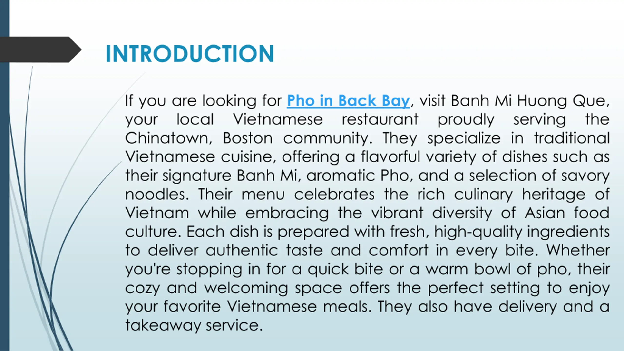 INTRODUCTION If you are looking for Pho in Back Bay, visit Banh Mi Huong Que, your local Vietnamese restaurant proudly serving the Chinatown, Boston community. They specialize in traditional Vietnamese cuisine, offering a flavorful variety of dishes such as their signature Banh Mi, aromatic Pho, and a selection of savory noodles. Their menu celebrates the rich culinary heritage of Vietnam while embracing the vibrant diversity of Asian food culture. Each dish is prepared with fresh, high-quality ingredients to deliver authentic taste and comfort in every bite. Whether you're stopping in for a quick bite or a warm bowl of pho, their cozy and welcoming space offers the perfect setting to enjoy your favorite Vietnamese meals. They also have delivery and a takeaway service. If you are looking for Pho in Back Bay, visit Banh Mi Huong Que, your local Vietnamese restaurant Chinatown, Boston community. They specialize in traditional Vietnamese cuisine, offering a flavorful variety of dishes such as their signature Banh Mi, aromatic Pho, and a selection of savory noodles. Their menu celebrates the rich culinary heritage of Vietnam while embracing the vibrant diversity of Asian food culture. Each dish is prepared with fresh, high-quality ingredients to deliver authentic taste and comfort in every bite. Whether you're stopping in for a quick bite or a warm bowl of pho, their cozy and welcoming space offers the perfect setting to enjoy your favorite Vietnamese meals. They also have delivery and a takeaway service. proudly serving the