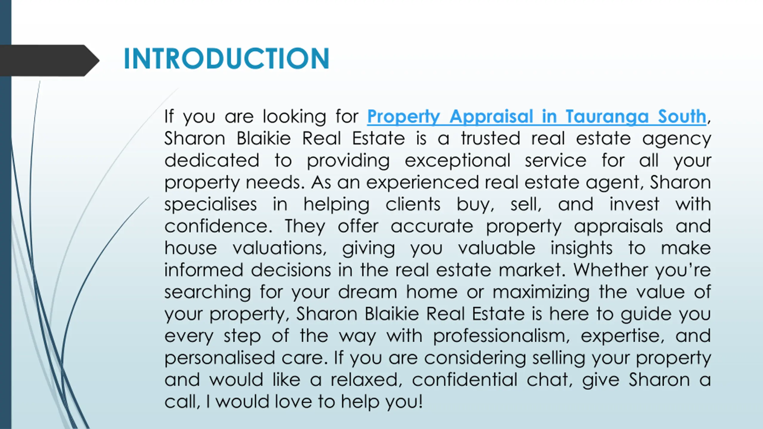 INTRODUCTION If you are looking for Property Appraisal in Tauranga South, Sharon Blaikie Real Estate is a trusted real estate agency dedicated to providing exceptional service for all your property needs. As an experienced real estate agent, Sharon specialises in helping clients buy, sell, and invest with confidence. They offer accurate property appraisals and house valuations, giving you valuable insights to make informed decisions in the real estate market. Whether you re searching for your dream home or maximizing the value of your property, Sharon Blaikie Real Estate is here to guide you every step of the way with professionalism, expertise, and personalised care. If you are considering selling your property and would like a relaxed, confidential chat, give Sharon a call, I would love to help you!